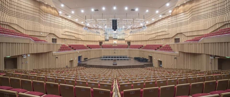 音樂廳總建筑面積28161㎡,巨大的懸挑體量,形成一種如揚(yáng)帆起航的巨輪一般向江面行駛之勢(shì)。音樂廳外墻采用紋樣1m*3m的混凝土掛板,采用中國古樂“瀟湘水云”減字譜以及西洋五線譜號(hào)作為外墻紋理,體現(xiàn)古今旋律與中西音樂交匯于此的深刻含義。