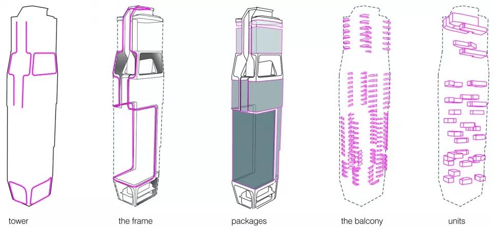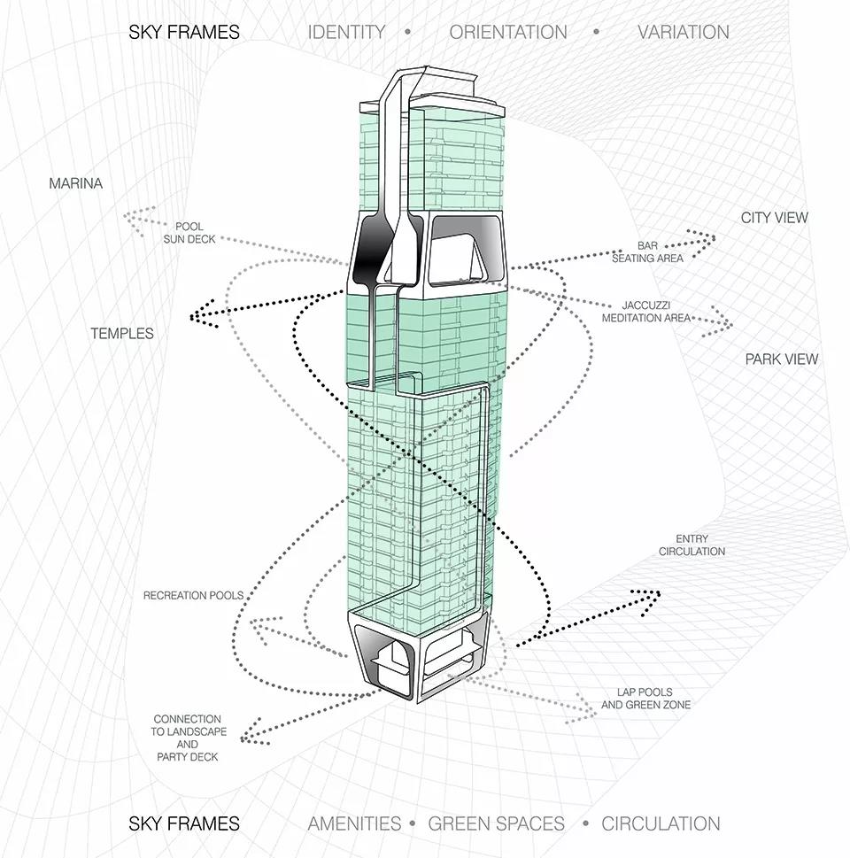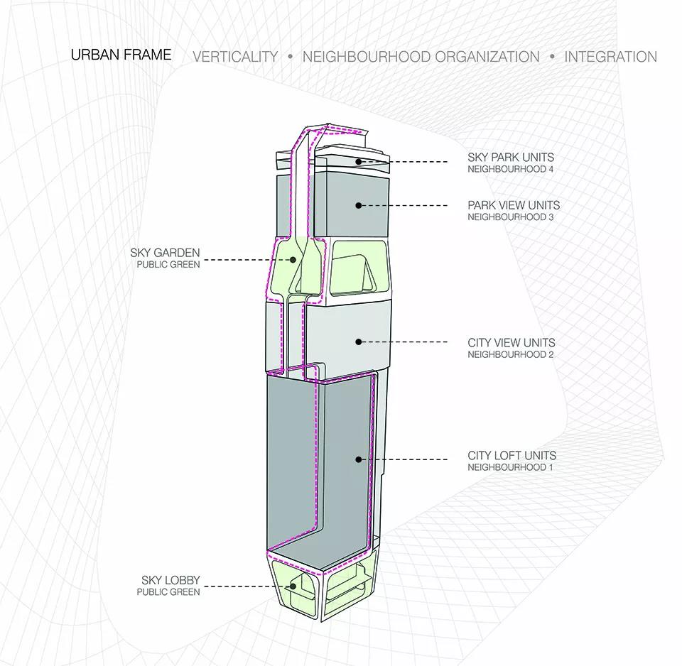 垂直城市的概念與綠化區域通過兩種形式緊扣在一起:“垂直框架”和“天空框架”。垂直框架以城市方式組織塔樓。它將塔樓整合為一個“垂直城市”,將四個住宅群劃分為不同的小區。