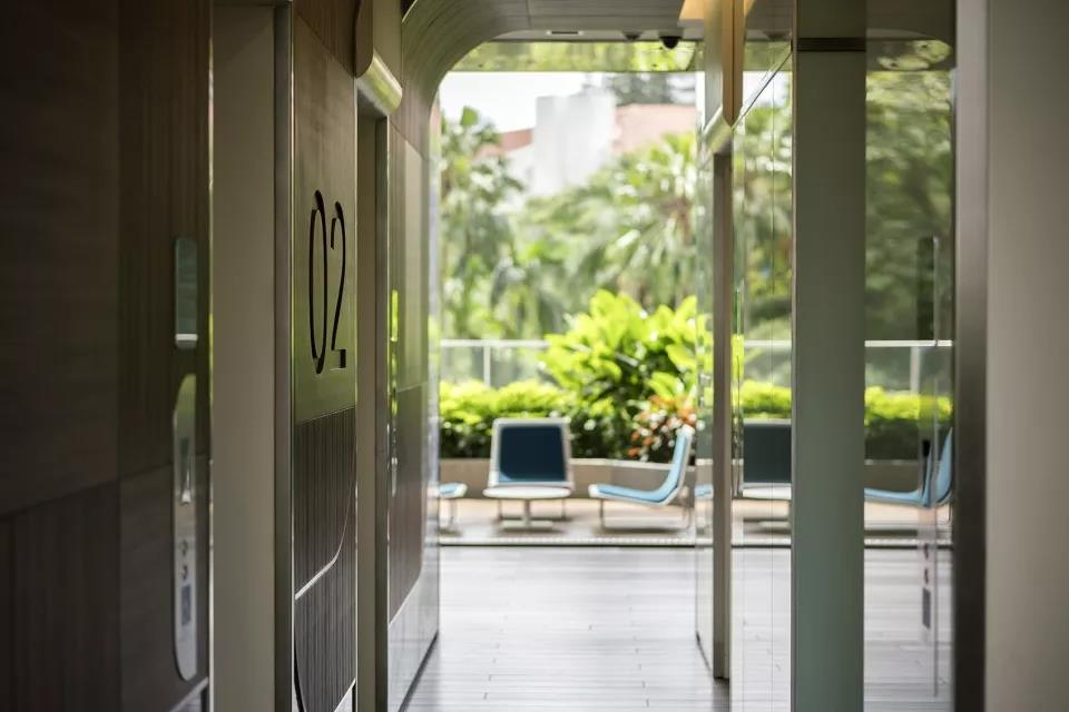 青翠的景觀連接了公共戶外空間,而塔樓升降機大廳通過使用天然材料來引入自然景觀到室內。大堂空間主要以柔和的木制線條和優雅的大理石地板飾面以強調自然元素,其余部份則采用油白玻璃以反映和擴大空間。大理石磚(90×90厘米)以隨機圖案布置在地板上,并延伸到大堂墻身,藉以以擴展視覺空間。