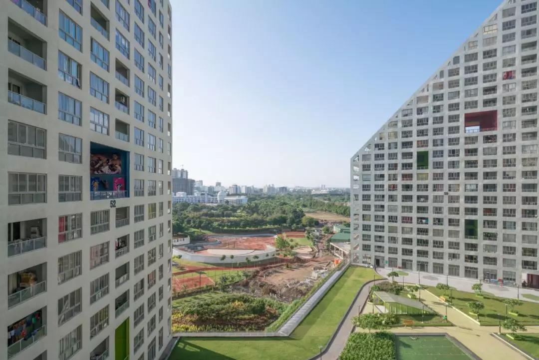 印度的建筑成本較低,但電梯費用相對昂貴,住宅設計通常應用的的經濟學原理可能會顛倒過來;因此,減少電梯核心筒的數量并與走廊相結合比建造多個擁有獨立核心筒和較少走廊的塔樓更經濟。根據這個計算結果,MVRDV的設計特色是圍繞4個循環核心筒布置9個17層到30層不等的住宅側翼。