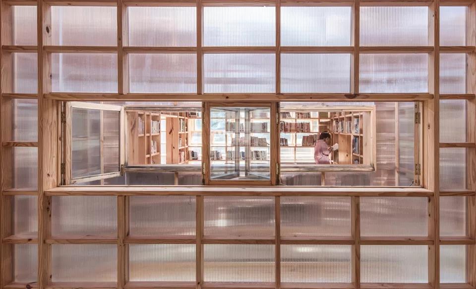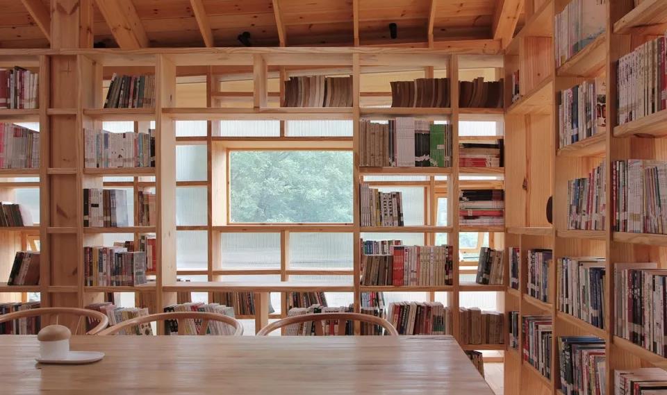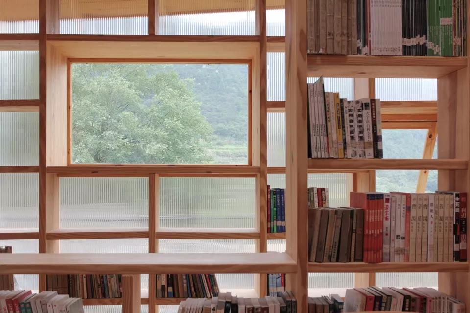 材料運用上,書屋的書架選擇3公分厚的松木板模數化布置,用統一的模數尺度語言控制,書架的豎檔和屋頂的結構梁用材一一對應,形成整體的語言邏輯體系。在外立面上,采用鄉村比較少見的陽光板,讓整個房子變成了一種半透明的狀態,室內的光線透過陽光板變得很溫和,給書屋室內形成一種舒適的閱讀環境,同時,半透明的材料可讓室內的人對室外景觀有一種若隱若現的朦朧美,實現一種半通透性的空間感受和氛圍的目的。