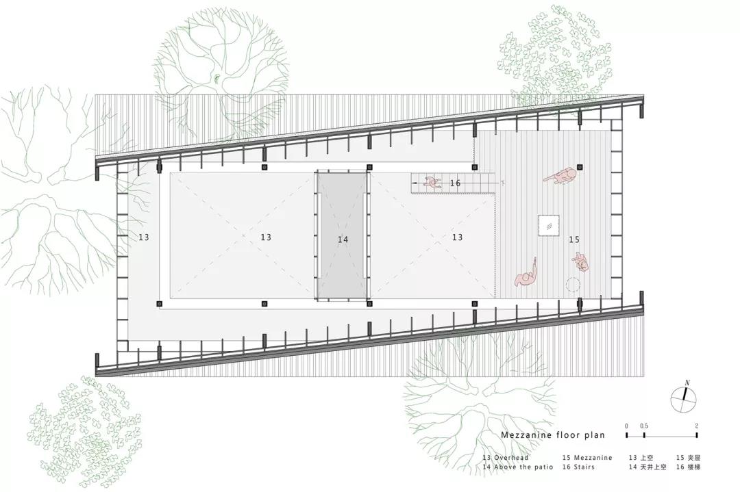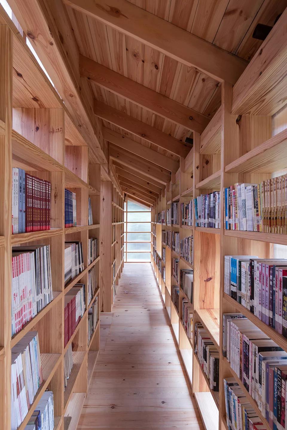 形態類型上,把書屋實體空間部分抬高,實體部分延續當地民居的雙坡屋頂形式和坡度,以及傳統的屋面順水做法和小青瓦的鋪設,卻在屋頂的屋脊上做了微小的設計動作,讓屋脊的角度做了6.5°小偏轉。使書屋的屋頂形態發生一點微妙的形態變化,屋頂的檐口一高一低,室內屋頂的傾斜結合均質書架的空間,讓空間發生變化。