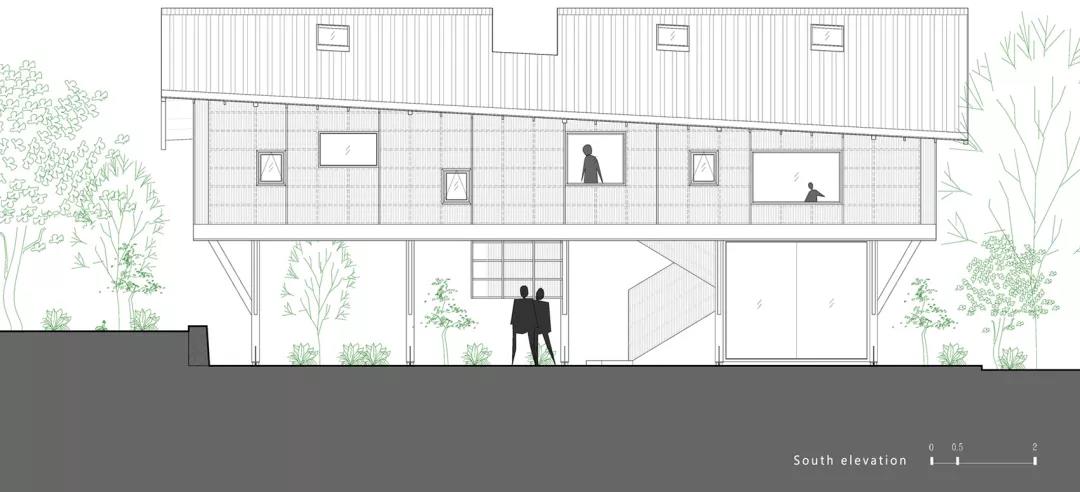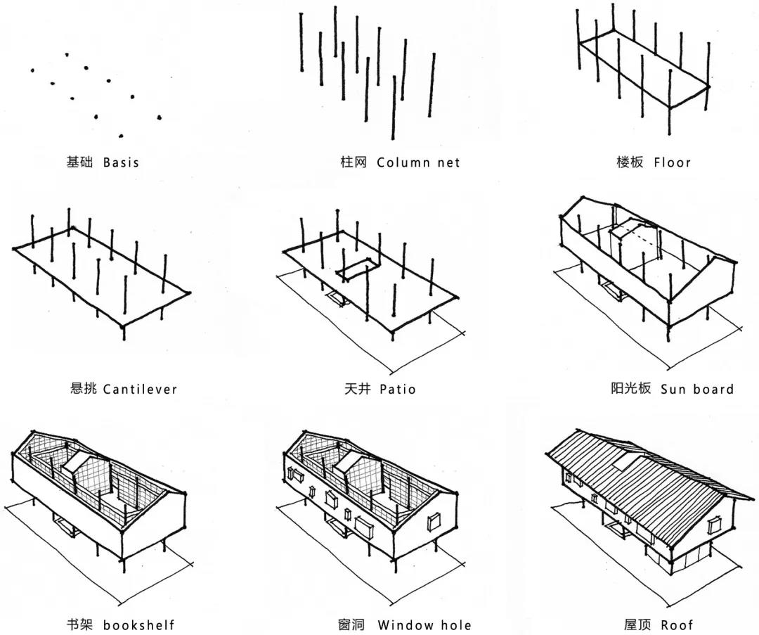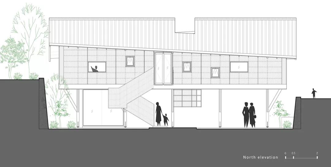 同時站在場地關系的角度思考,書屋用地處于一個三角地帶,南側是該村落的主要步行干道,北側有一堵三米高的石坎墻,石坎墻上面是一片兒童戲玩區,在設計策略上抬高書屋的實體空間部分,讓建筑體首層與道路之間形成空間的退讓,路上的行人也可以隨時到書屋下休息。而書屋的二層則和兒童戲玩區在同一空間層面上,這樣的處理,一方面便于兒童進入書屋看書或者在兒童區玩耍,另一方面,方便父母在書屋里閱讀的同時能關注到孩子。