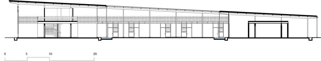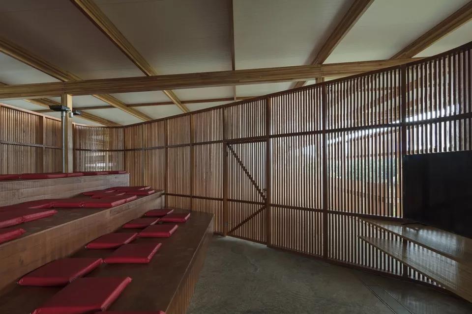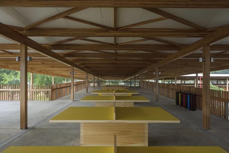 項目所在地區(qū)屬于熱帶氣候,夏季氣溫常常達(dá)到40多度,這也為建筑師帶來了挑戰(zhàn)。他們的解決辦法是,利用由交叉層壓木梁和立柱構(gòu)成的巨大屋頂來提供遮陽,同時借助向外伸出的頂篷來創(chuàng)造室內(nèi)和室外的過渡空間。