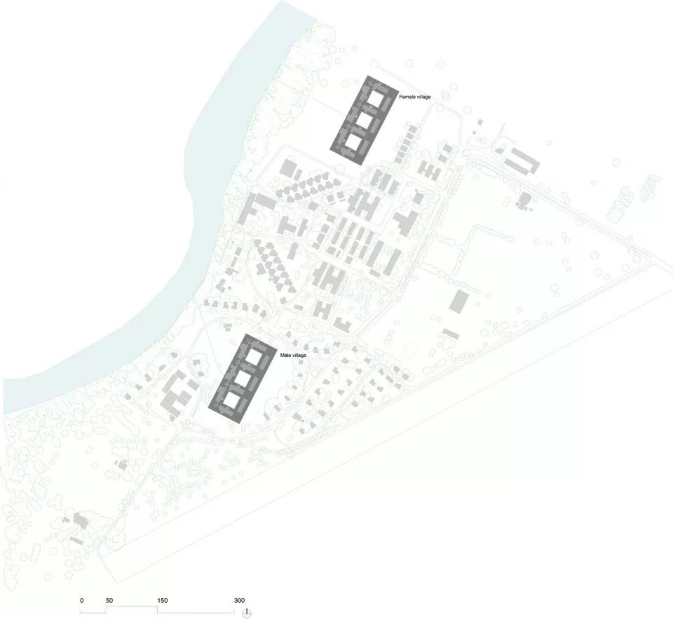 占地面積約2萬5千平方米的兒童村分為兩個完全相同的部分,分別用于男生和女生。宿舍樓環(huán)繞在三個開闊的遮陽庭院周圍。