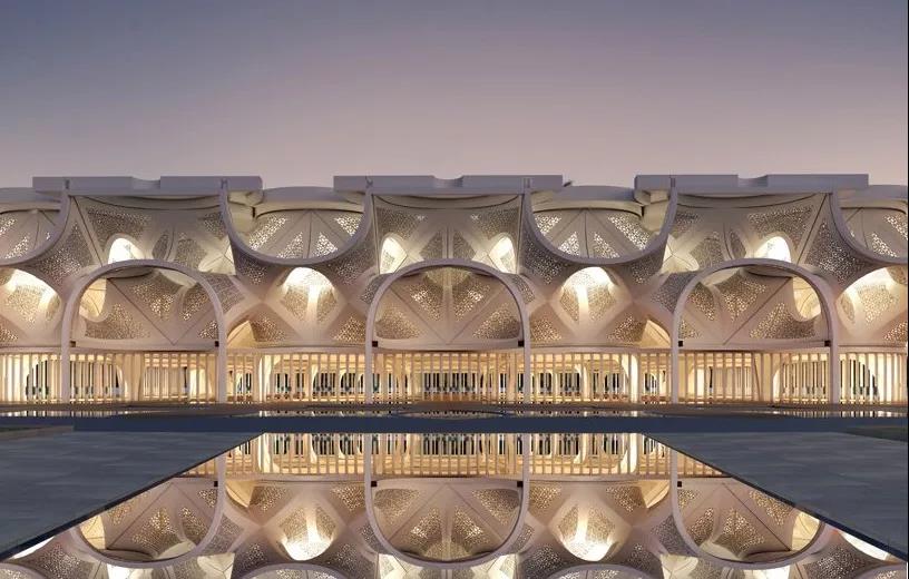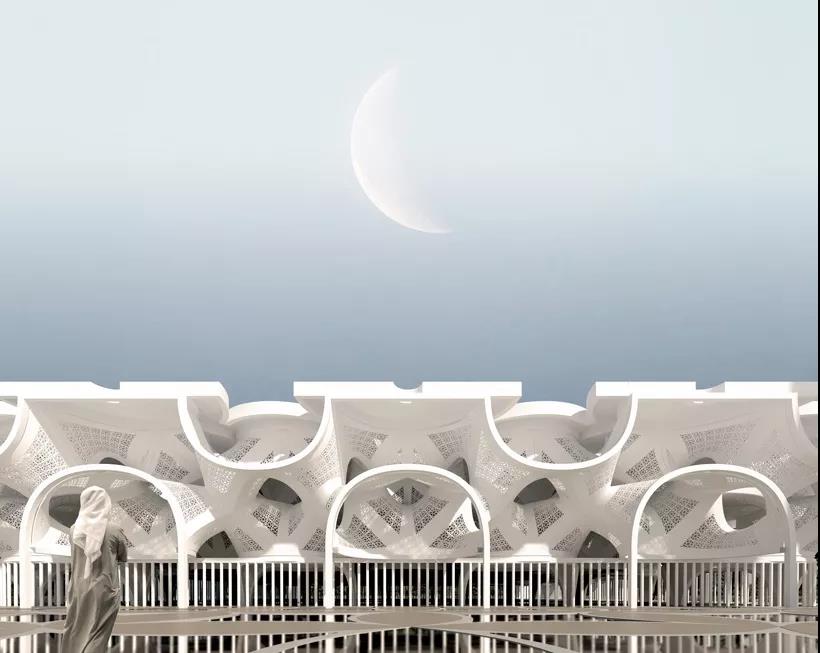 在室內,NUDES 建筑事務所做的設計既擺脫了正規的圖案,又能夠從雙曲表面上反射光線。而反過來,由一些簡單的幾何結構形成的一系列“mashrabiya”開口還能夠強化這種效果。 這種系統能夠保護陽光,并可以為禱告和聚會提供一個涼爽、舒適的空間。