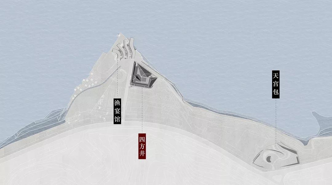 天宮包用地被商業、居住用地包圍,設計以緩坡的形式將建筑體量融于自然山體的起伏之中。四方井碼頭是深入江面的一個三角洲地形,場地包括漁宴館和四方井服務建筑項目。漁宴館在三角形的頂部,四方井項目位于漁宴館的后面。在這些建筑中,四方井服務建筑是首先落地的項目。