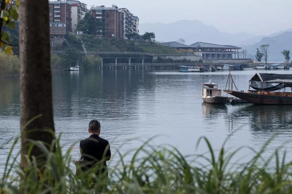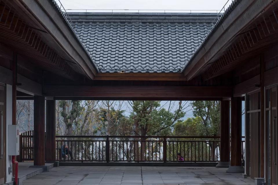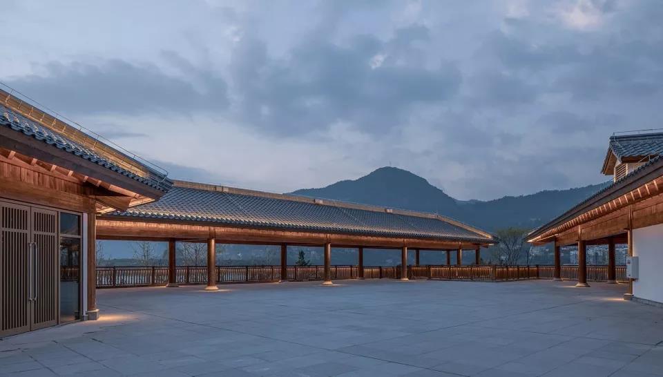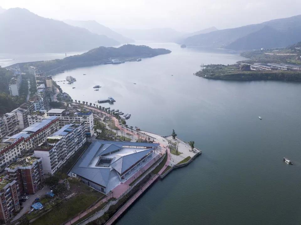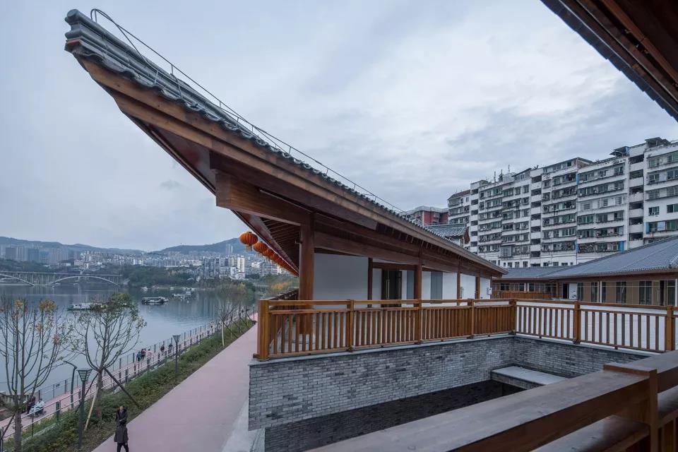 澎溪河寬闊的河面上,遠處的層疊山脈延伸入江水中,在基座之上,四方井服務建筑的坡屋頂沿著江面漂浮展開,融入遠處山峰的輪廓。