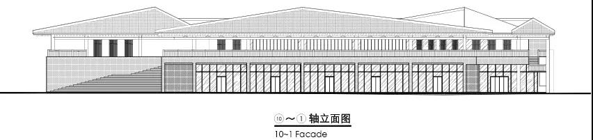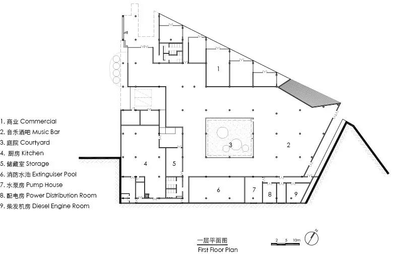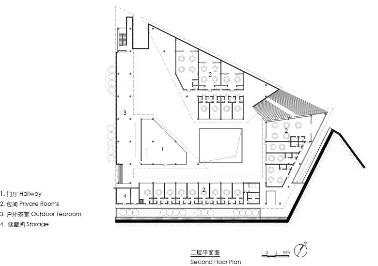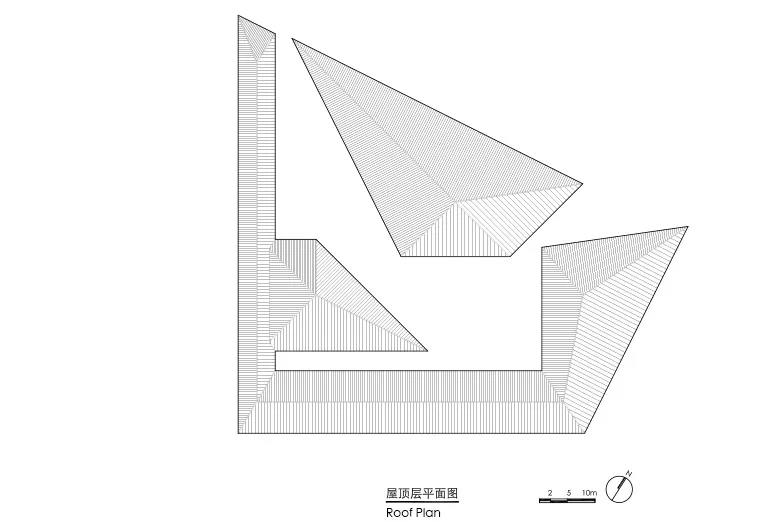 其中首層與北側濱江景觀帶相接,二層與西側城市道路相接。基座的建造轉換了地景,提供了觀看江景的平臺,如同伍重面對悉尼港,屋檐與基座也成為我們解答風景與場地這一命題的答案。