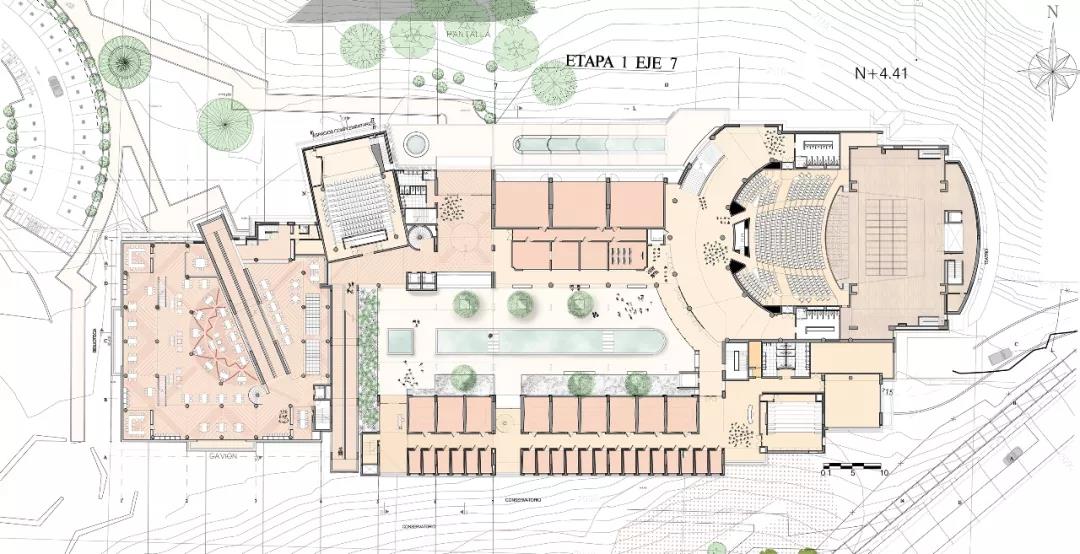 文化中心由大型圖書館、科學中心、180座的禮堂、咖啡廳、陳列室、露天觀眾席、音樂學校、辦公區(qū)及為行政和文化活動準備的會議室組成。600座的劇場將會在不久的未來增置進來,為音樂學院提供配套服務。