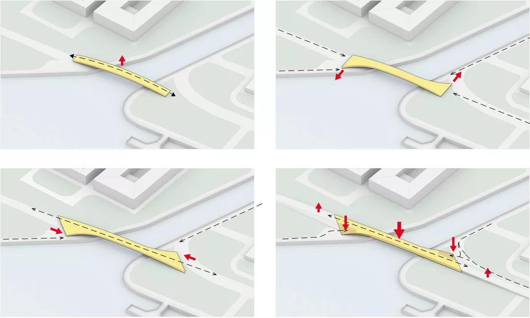 在兩座云橋的設計中,我們試圖探討在常見的線形橋身之外是否還有別的可能性,并且形成連貫的設計語言,以此強化雙橋的印象。因此在兩座橋的設計中,都在嘗試演繹一些幾何形態上的變化,也充分考慮到與橋兩端城市、景觀環境的銜接。