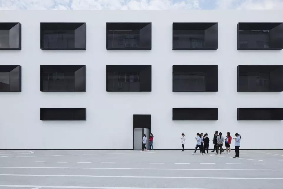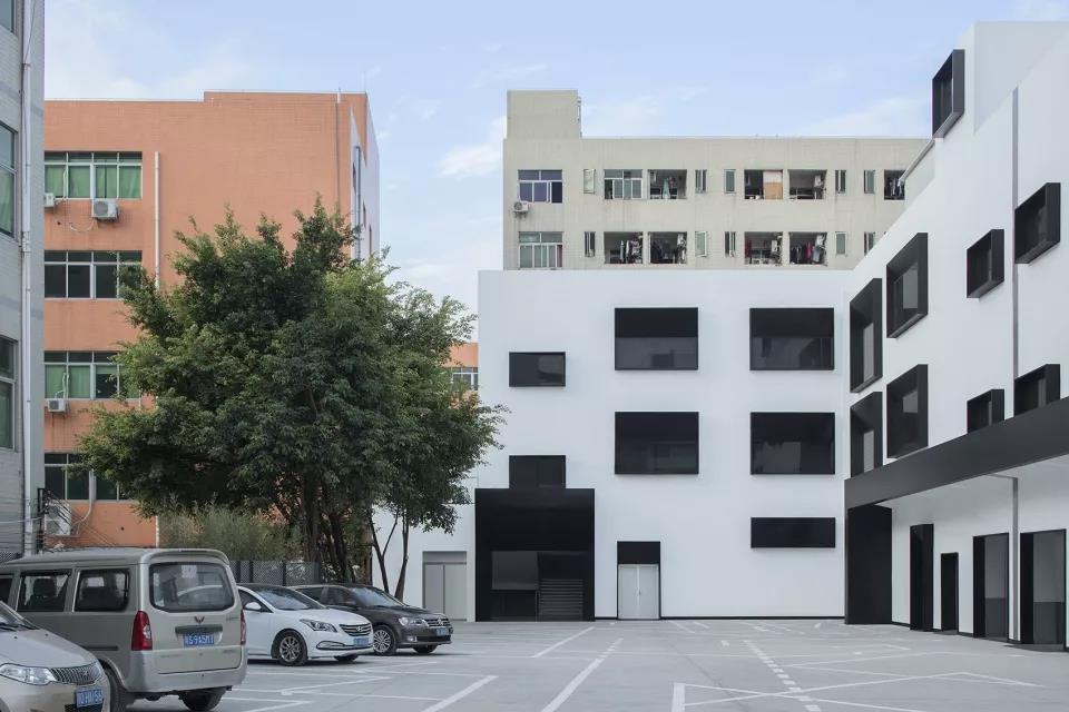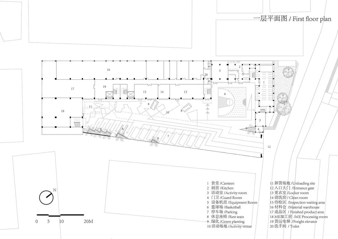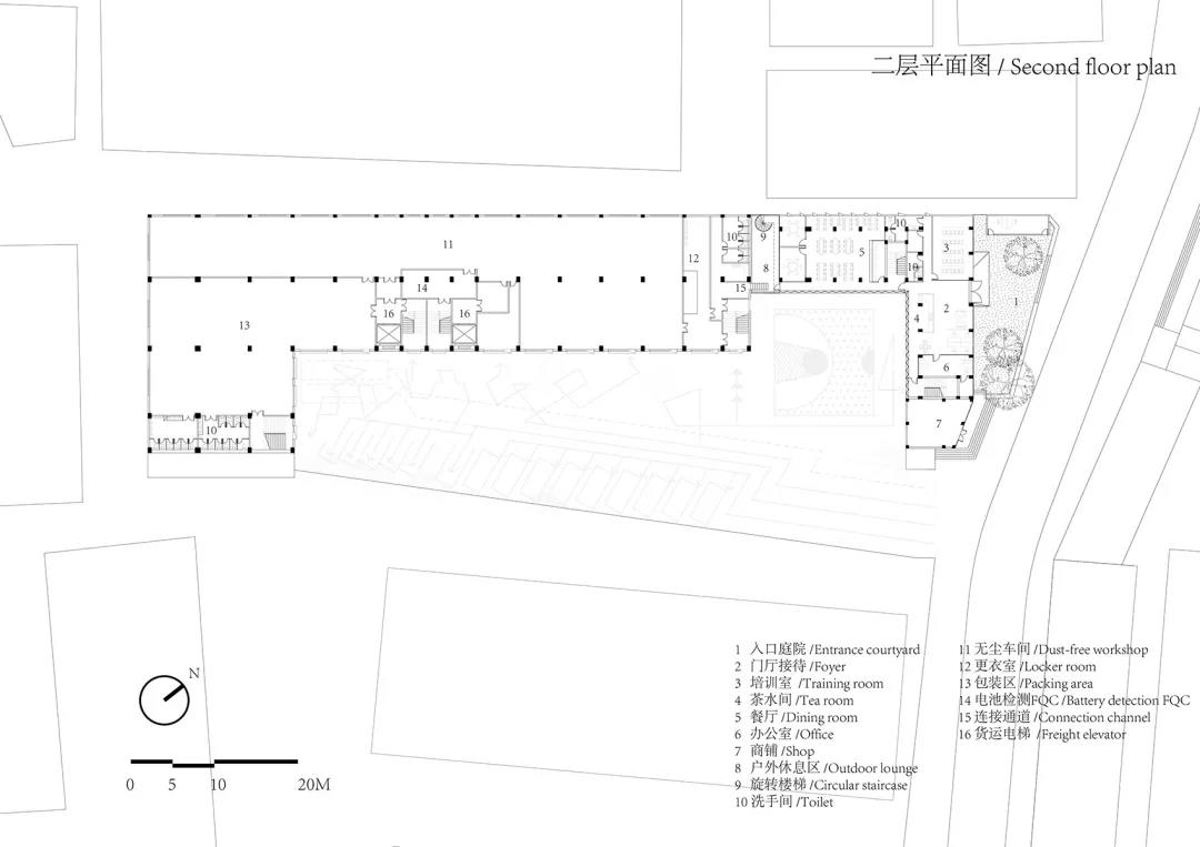 該建筑與城市道路形成的三角形空間被改造成研發辦公人員進入室內空間的庭院,沿道路邊種植的竹子形成新的城市邊界。技術生產工人與車行通道的形象入口位于場地東北側。