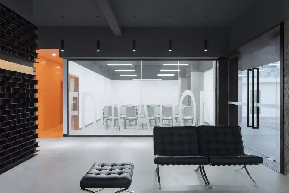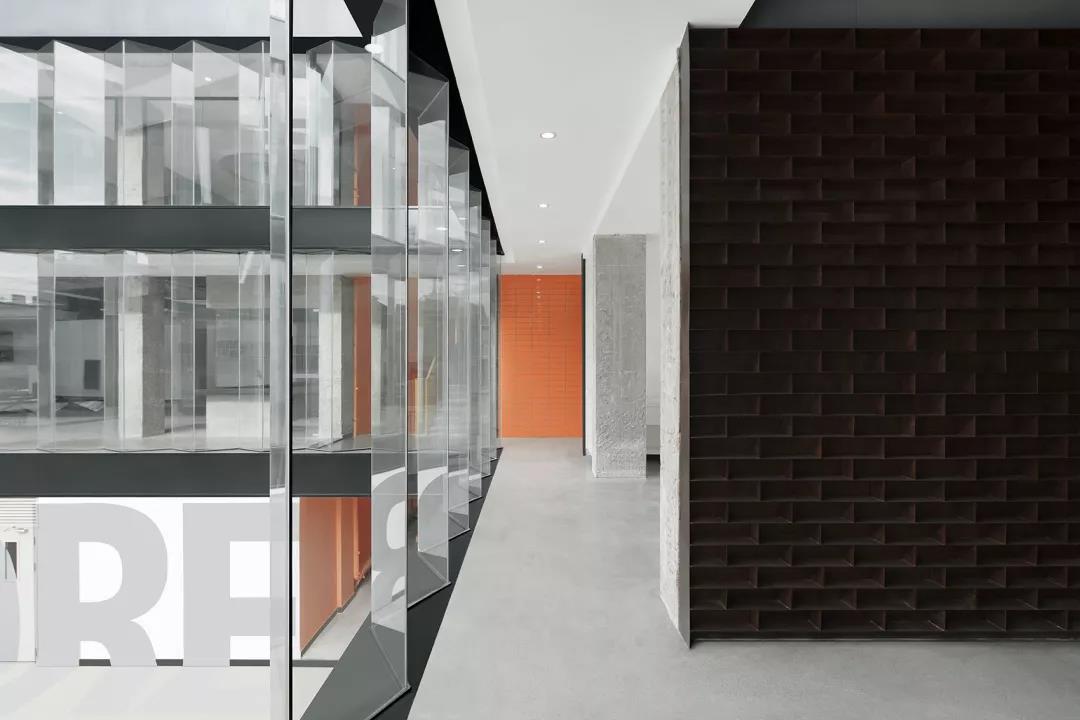 位于辦公建筑與廠房中部螺旋形樓梯與休閑平臺通道成為研發辦公人員與技術生產試驗車間的重要紐帶。大尺度的廠房建筑立面保留了原有窗洞位置,大門與窗框做形態上的處理,與周邊廠房建筑產生差異化的同時又存在與周邊廠房建筑屬性的關聯。