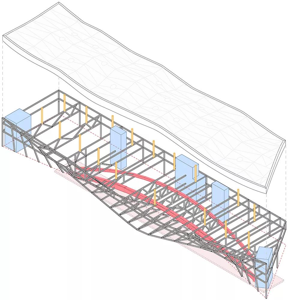 設計概念以三個獨立的公共樓層為基礎,通過在首層空間上方置入跨度超過100米的不對稱橋梁結構而得以實現。該橋梁結構由鋼桁架和鋼梁構成,并由兩個巨大的拱形鋼結構提供支撐,其外部包覆以鋼筋混凝土張力板。