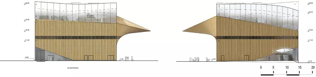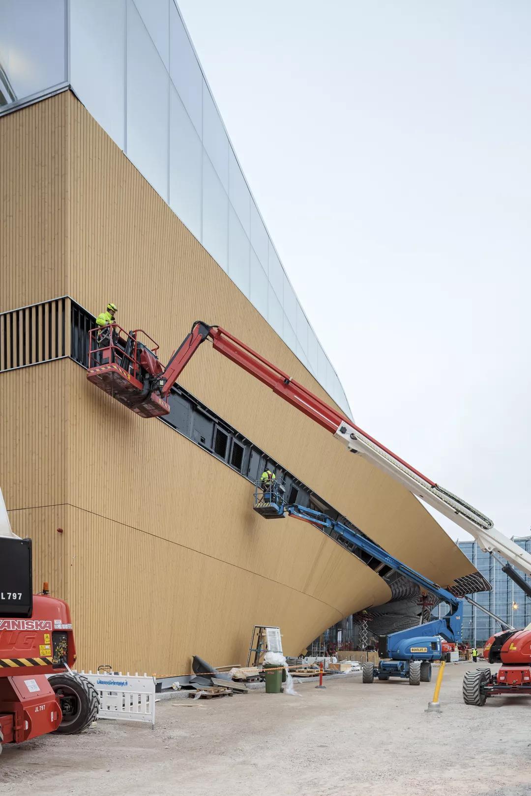建筑采用當地材料建造,并充分考慮了當地的氣候條件。木制立面由預制單元構成。33毫米厚的優質芬蘭云杉木被用于外墻飾面。項目團隊還特別為木材的切割和加工開發了新的評級和質量控制系統。