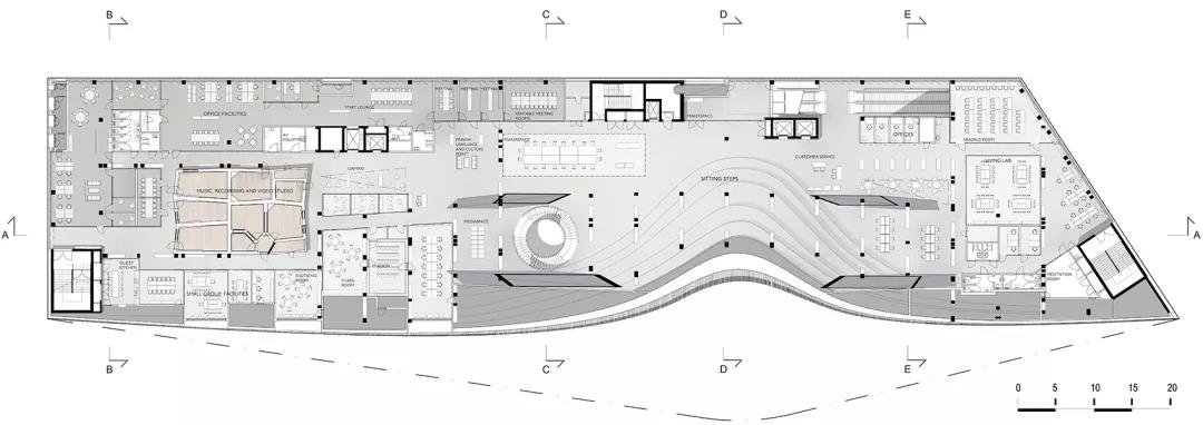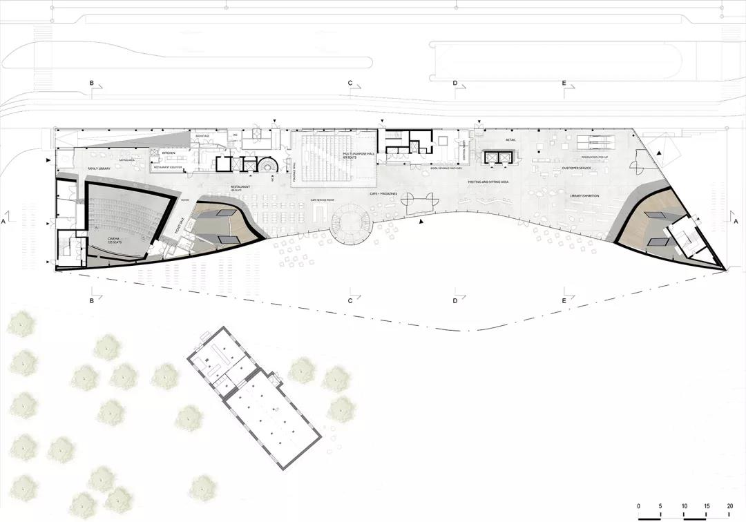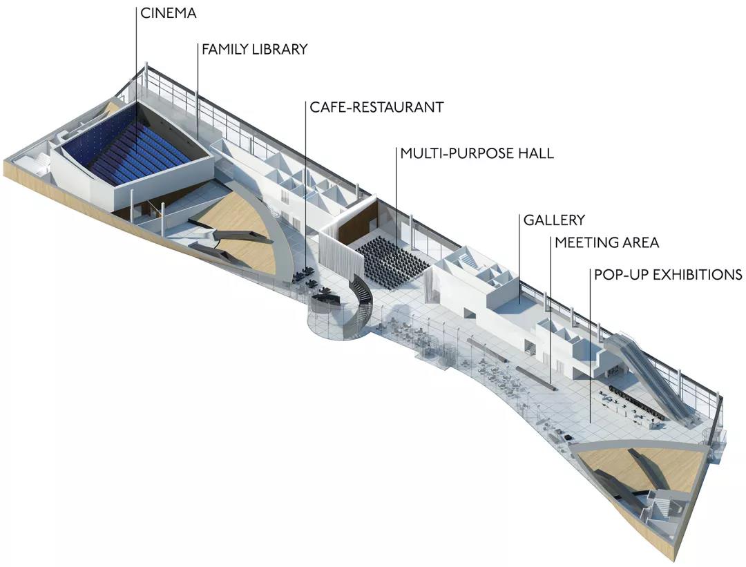 電影院和多功能廳可與開放式大廳連接為一個整體,也可以分開使用以滿足不同的活動需要。穿越首層空間即可大致了解整棟建筑的功能和服務。