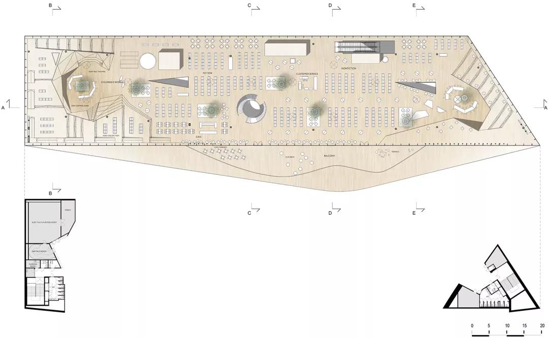 設備和后勤空間位于地下層。行政辦公室和倉庫盡可能地遠離公共樓層,從而最大化地加強圖書館的開放性和可達性。