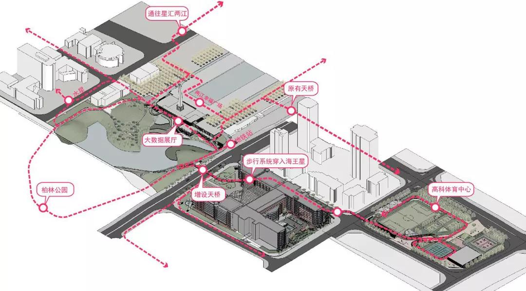 而在本項目之前,我們就一直在為政府背景的平臺開發公司提供設計咨詢,希望在本片區打造更完備的步行體系甚至空中游廊體系,更高效地連通被星光大道隔斷的寫字樓群東西兩區。