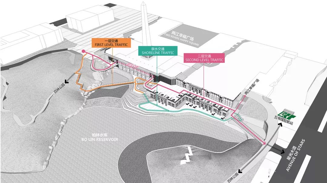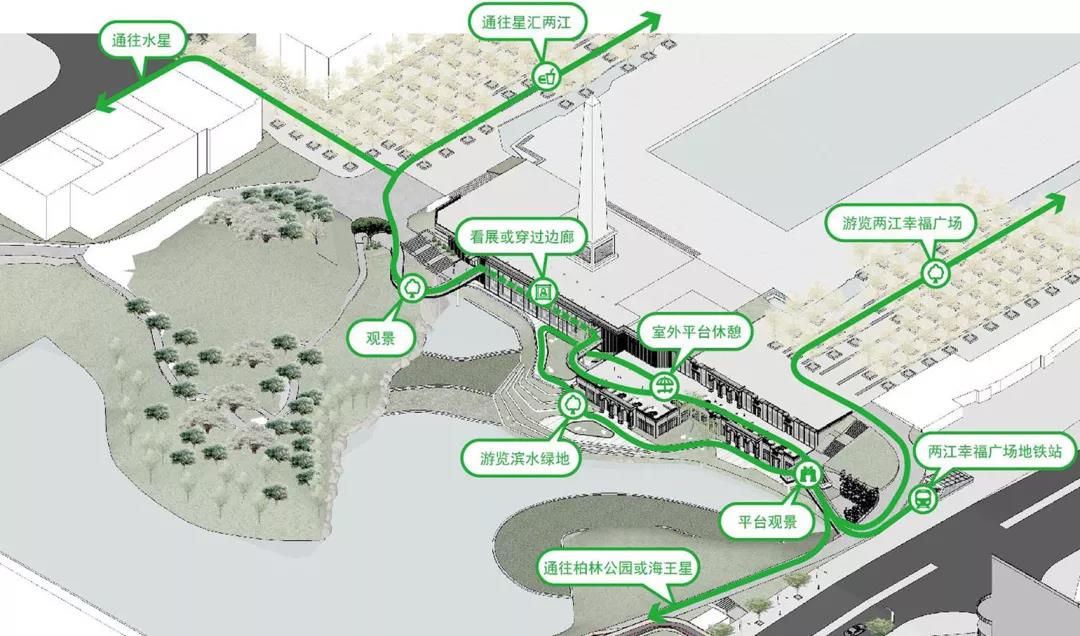 為了實現片區步行體系升級,我們在場地中置入了三個新交通體,通過坡道來連接室內建筑與濱水景觀區,并打通了場地的東西步行脈絡,形成了貫穿整個場地的游覽主線,同時,沿途創造了一系列的游覽節點,如外挑觀景臺及向市民開放的室內觀景外廊,營造豐富多變的步行體驗。