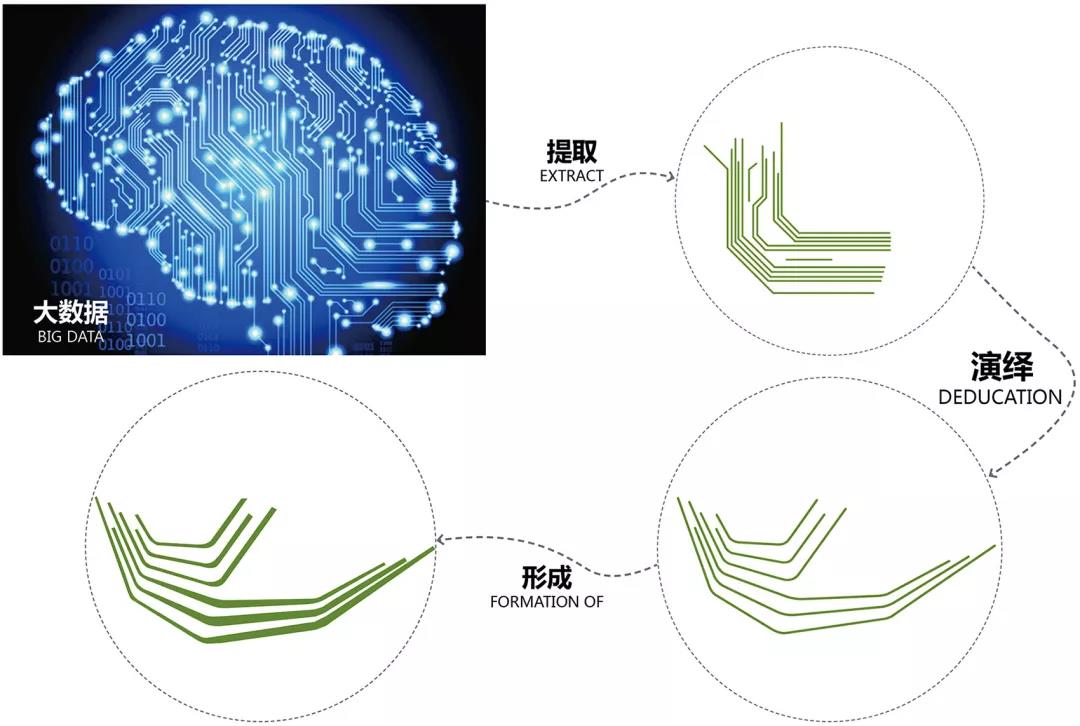 景觀生成分析圖,提取大數據傳輸的 “點+線” 的模式,結合場地地形合功能布局,形成特有的景觀形式