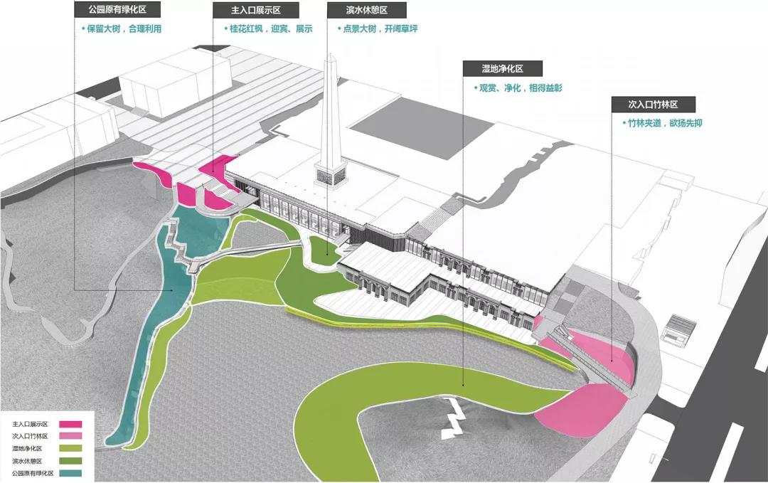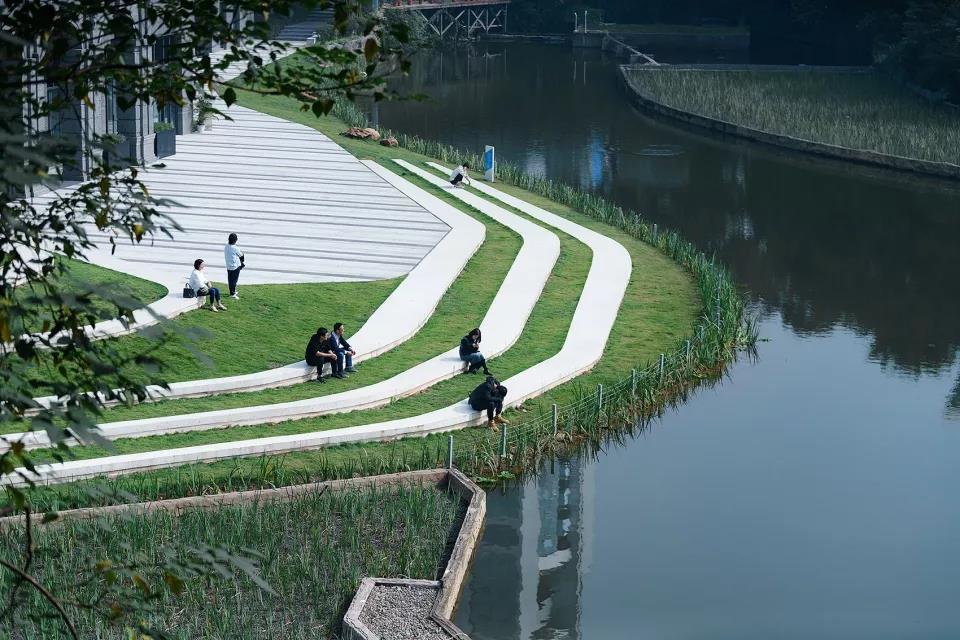 整體交通上采用無障礙景觀橋和退臺式生態草階的設計手法將存在高差較大的區域聯動起來,構筑多層次的景觀空間場地。