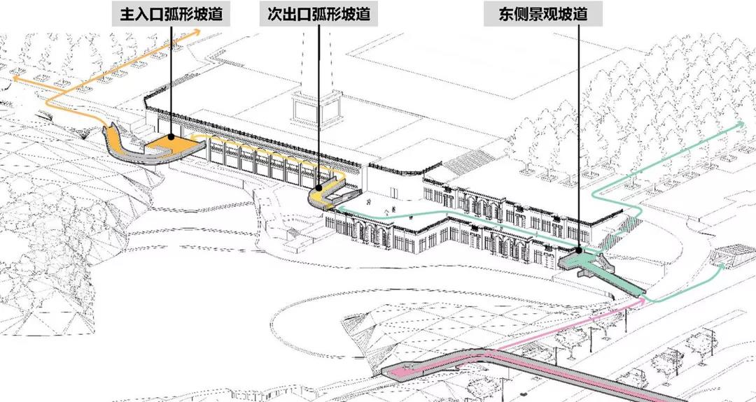 為營造舒適豐富的游覽路徑,我們在原場地中置入了三個無障礙交通體和一個景觀交通體,通過交通體景觀橋方式的來連接建筑室內展廳與室外場地和周邊地塊,打通場地的步行脈絡,形成整個場地的游覽主線。采用無障礙通道的方式滿足不同人群的使用需求,同時解決展廳設備運輸問題。