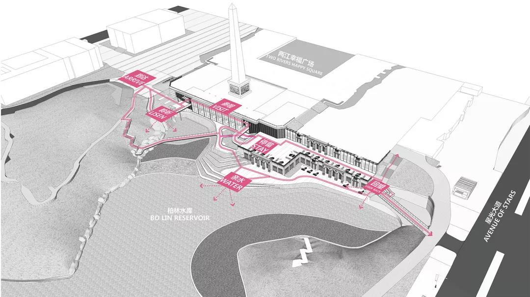 游廊串聯體系分析圖,坡道連接室內建筑與濱水景觀區