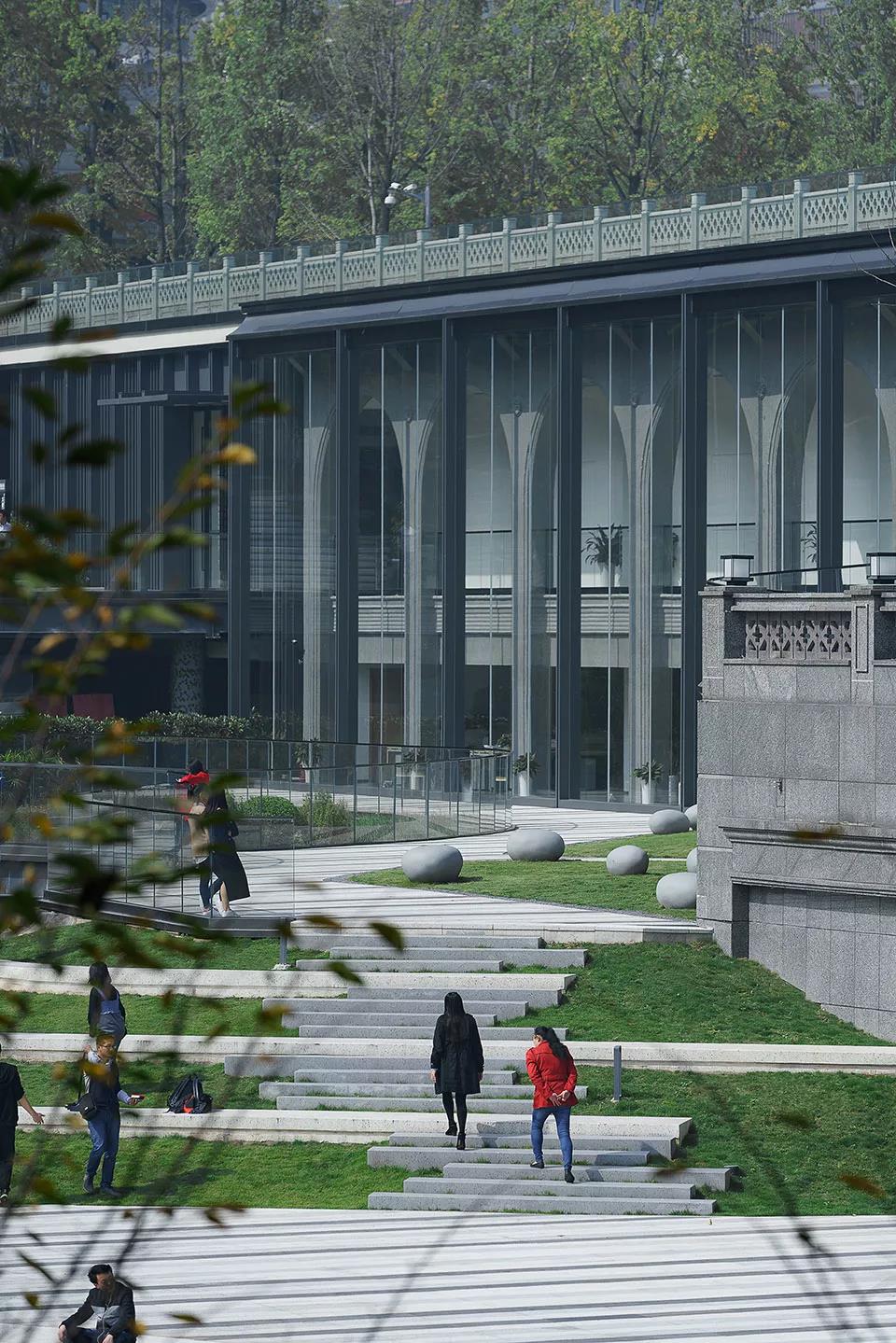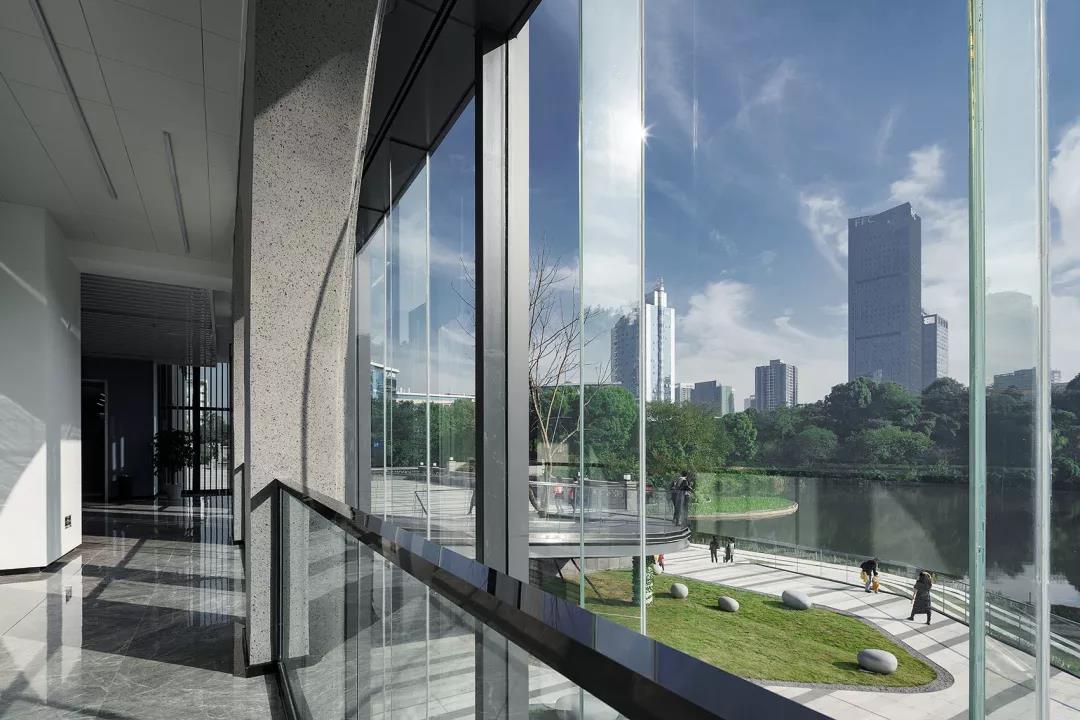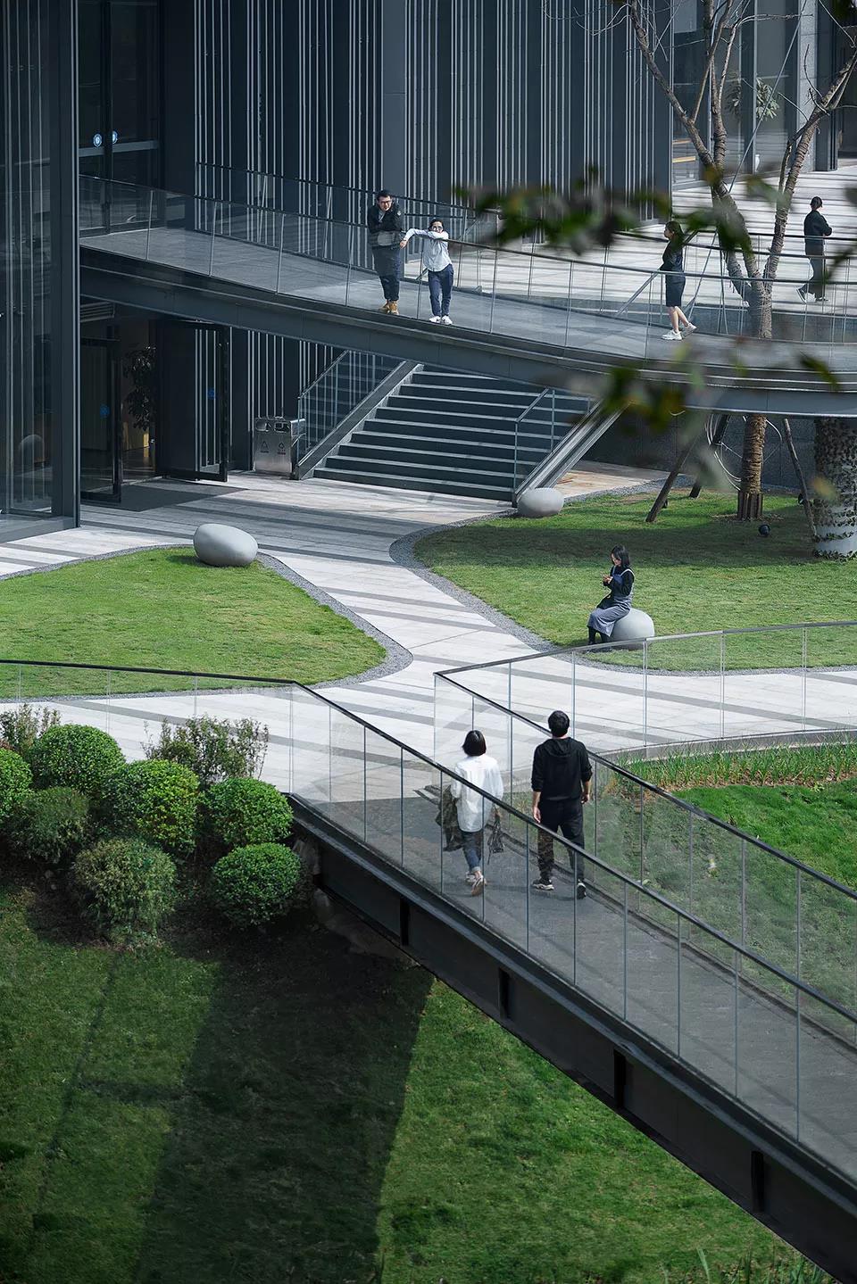 緊鄰建筑幕墻的景觀草坪,采用草坪、石材鋪裝、玻璃欄桿的簡潔方式去布置