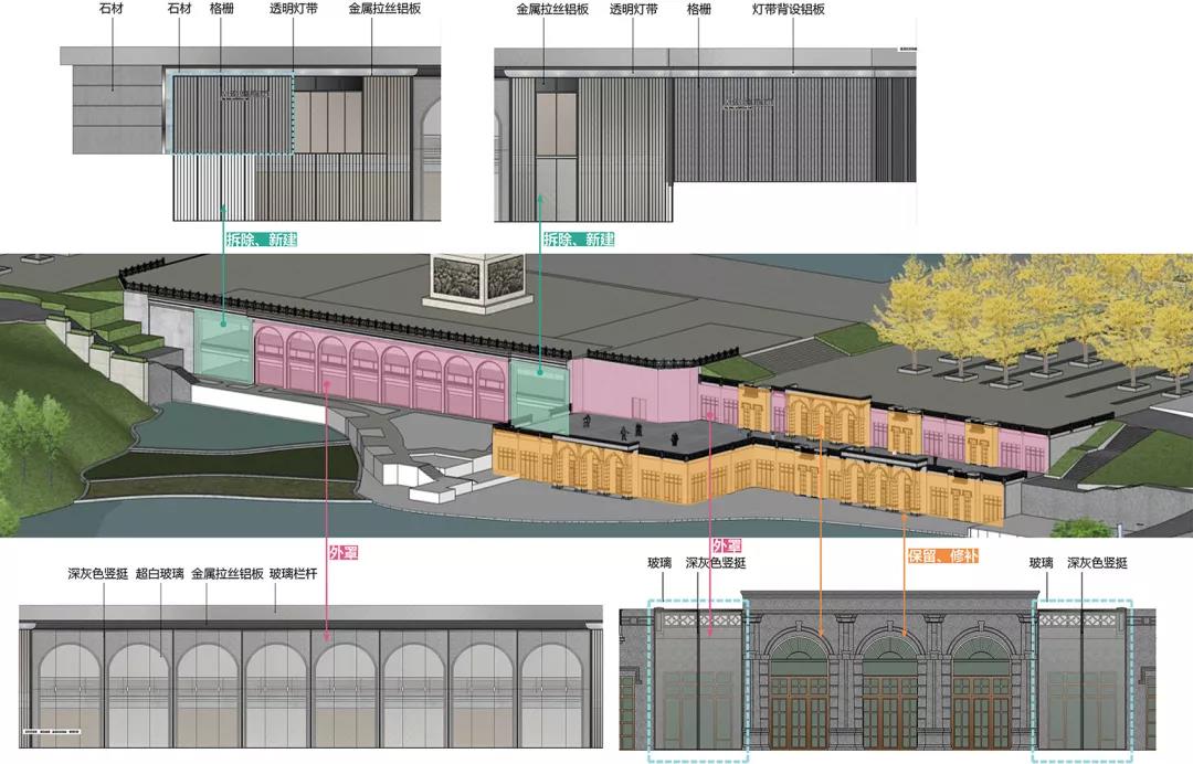 經過細致的實地踏勘,對于個別風貌突兀破舊的立面,我們予以拆除,換以與風貌色彩協調的豎向金屬格柵;對于較統一的立面元素,我們采用“外罩”玻璃體的方式進行風貌轉換;對于干掛石材的立面部分,我們進行了保留,并補齊外墻凹凸缺口,提升立面整體感。
