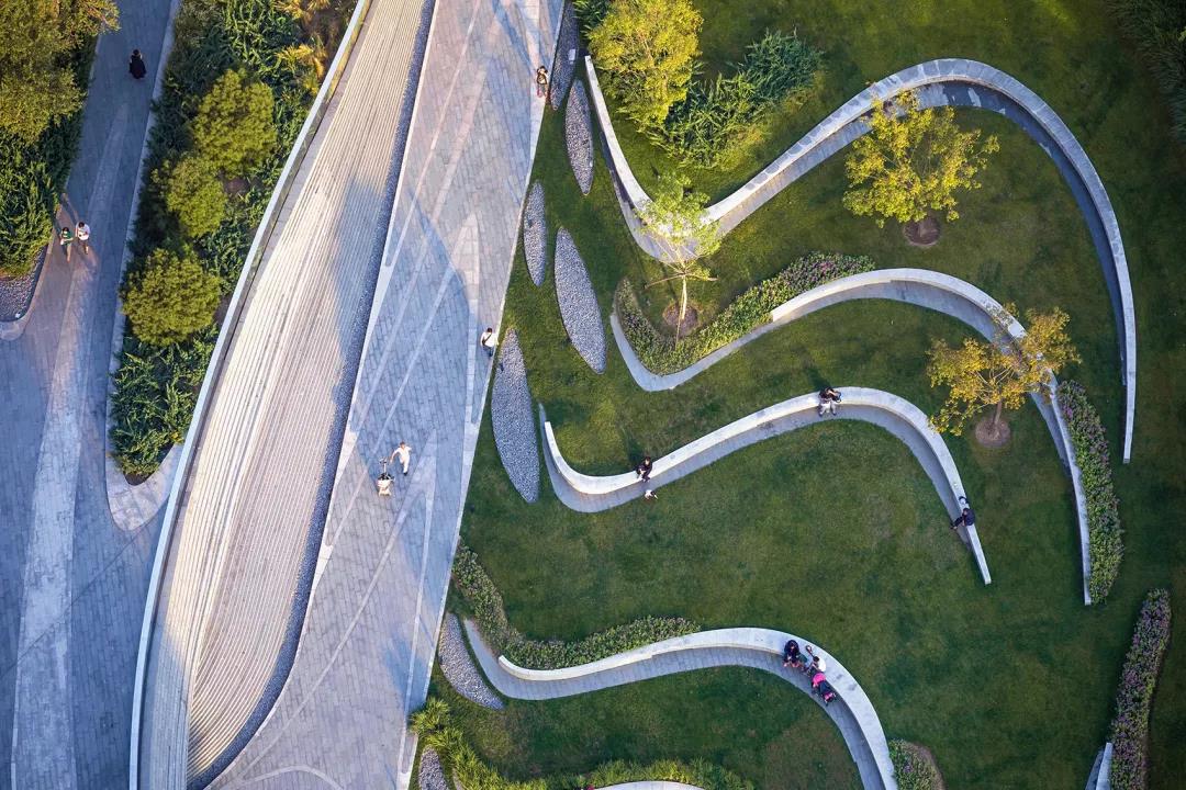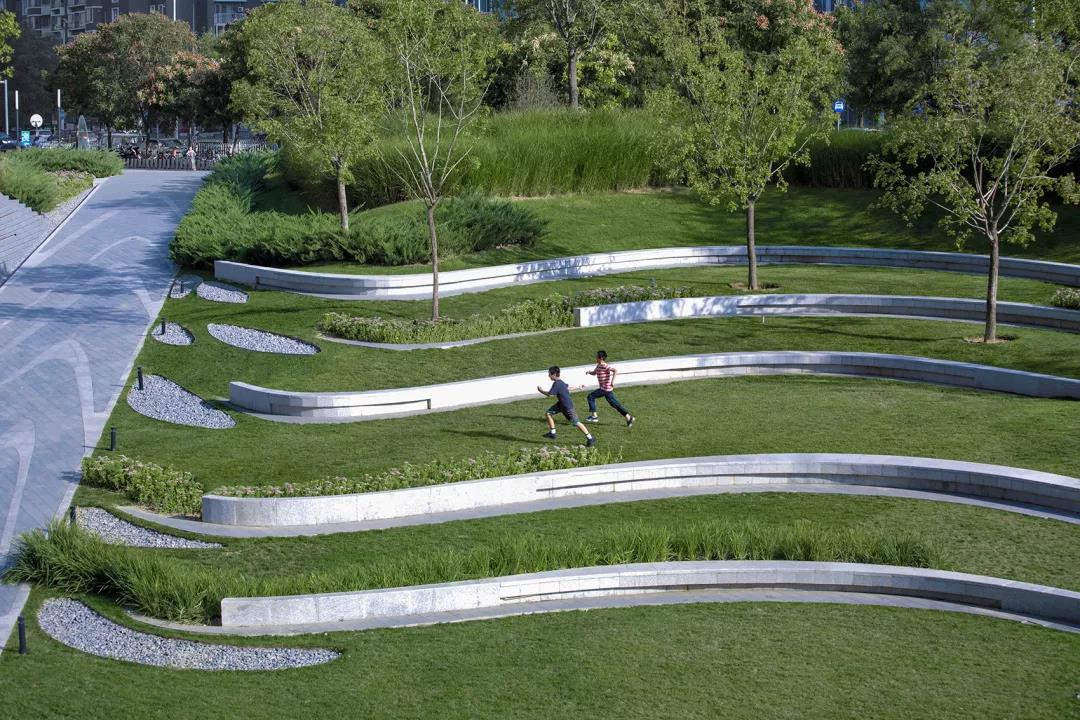 青翠的草坪與花崗巖條凳穿插于傾斜的地形之中,自然階梯式的地形處理特色,大面的開(kāi)敞草坪預(yù)留出開(kāi)闊的視野讓視線更為開(kāi)闊。