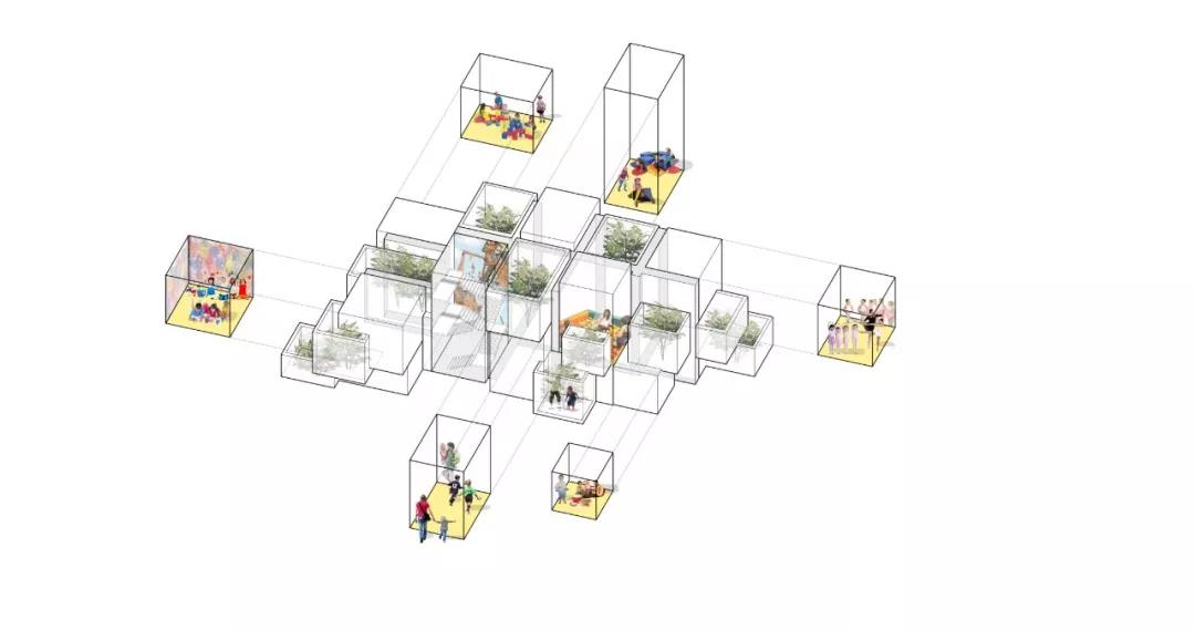 基本單元從教室開始,最終轉(zhuǎn)化為各種戶外空間,如空無一物的天井、露臺、室外操場等,形成了類似于攀登架的滲透組合空間。為了避免建筑的某些形狀,建筑附加了無屋頂?shù)牧⒎襟w,以鼓勵孩子們尋找開闊的風(fēng)景、天空和想象力。而透明的玻璃立方體組成的主要交通流線被設(shè)計成“他們的甜橙樹”,展示了一起生長的想象,感受大自然的活力。