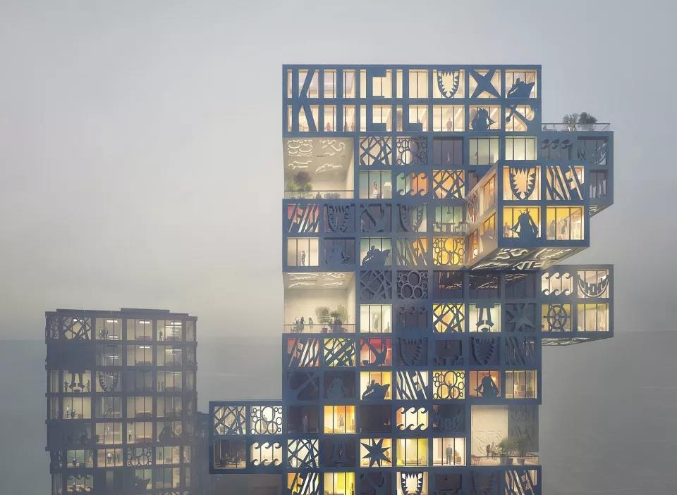 由纖維增強(qiáng)混凝土制成的立面面板是該項(xiàng)目最引人注目的元素,它被置于窗前,向人們展示各種匯集當(dāng)?shù)鼐用駝?chuàng)意的圖像標(biāo)志。