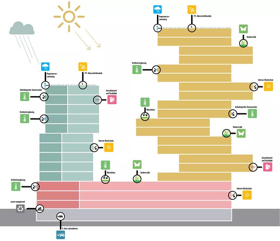 這種靈活的設(shè)計(jì)系統(tǒng)可提供的選擇包括改變酒店塔樓懸臂的規(guī)模和數(shù)量,改變建筑物圖形面板覆蓋的范圍,以及改變W8大樓頂部加蓋公寓的大小、數(shù)量和布局。