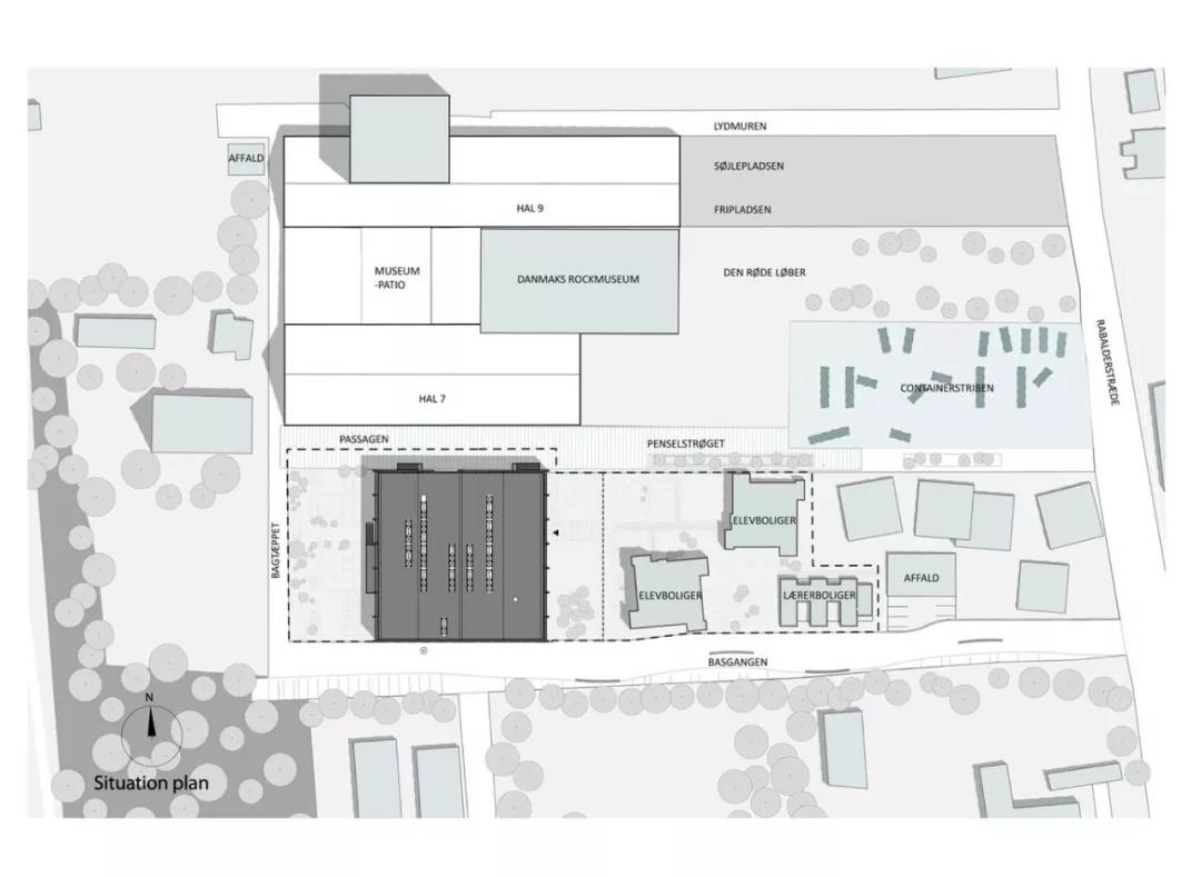 羅斯基勒音樂學(xué)校及其校園是1.1萬平方米的羅斯基勒新?lián)u滾音樂文化中心總體規(guī)劃的巔峰,該規(guī)劃旨在為蓬勃發(fā)展的丹麥青年文化打造一個(gè)令人鼓舞的中心。該規(guī)劃由教學(xué)樓、學(xué)生公寓和搖滾博物館(于2016年竣工)組成,博物館以其醒目的金色鋁立面展現(xiàn)了青年文化。羅斯基勒新?lián)u滾音樂文化中心的戶外空間很快將成為年輕人非正式聚會(huì)的重要場(chǎng)所,特別是在每年6月為期8天的羅斯基勒音樂節(jié)期間。