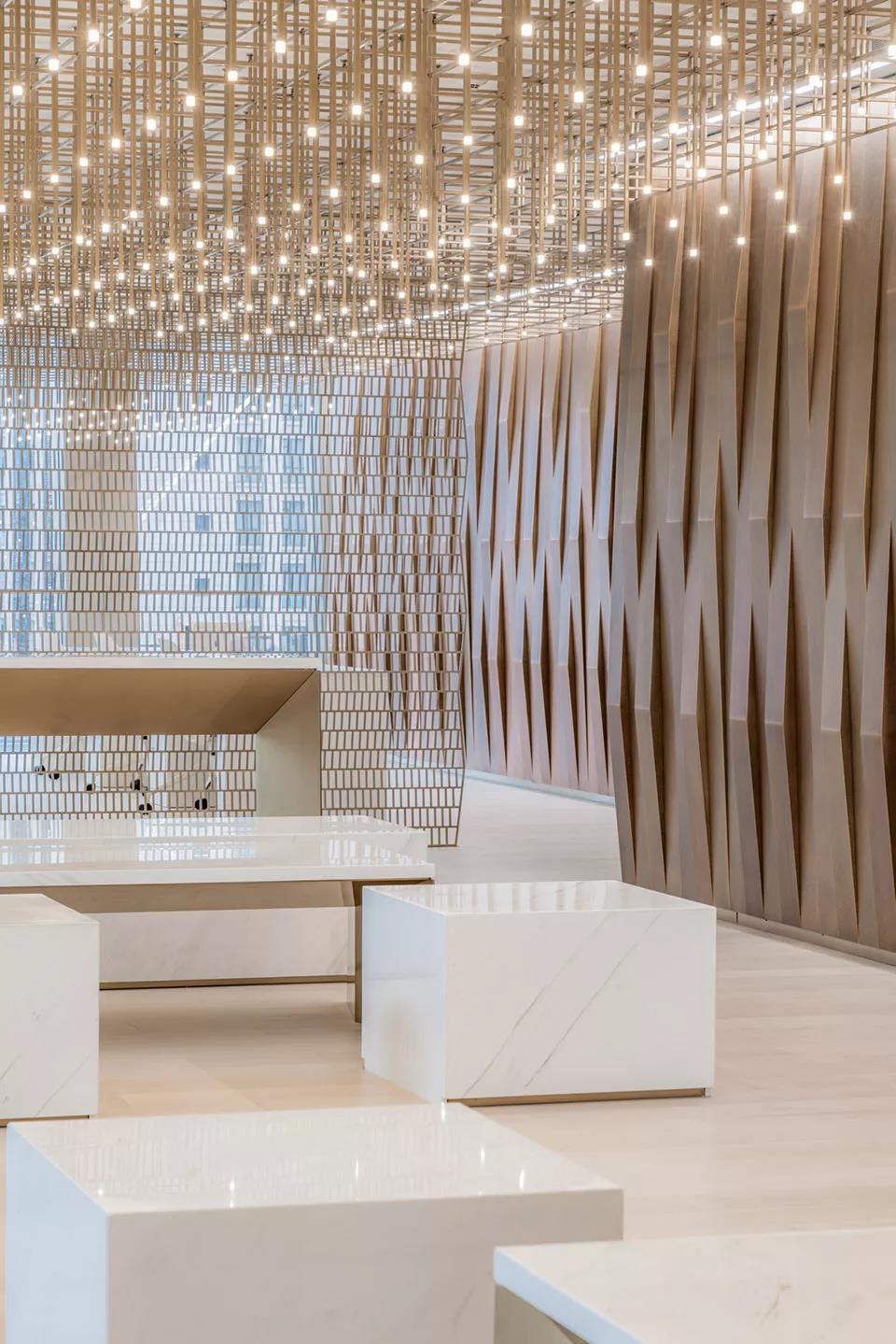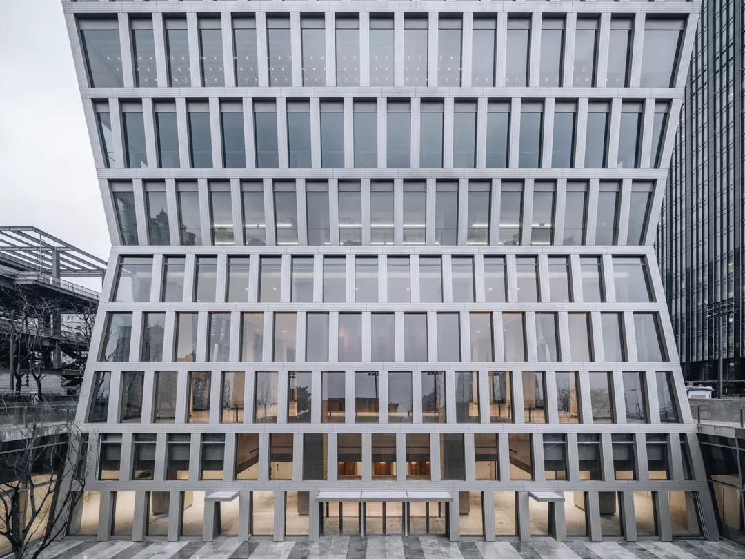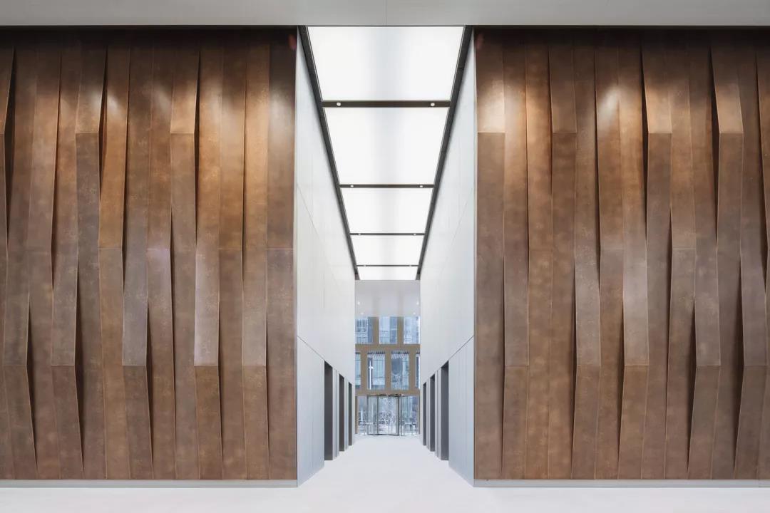 雕塑造型的每一側由四個堆疊體量組成。一系列轉換柱網形成的密集墻表面,起到有效遮陽、減小玻璃眩光、營造城市堅固感的作用。
