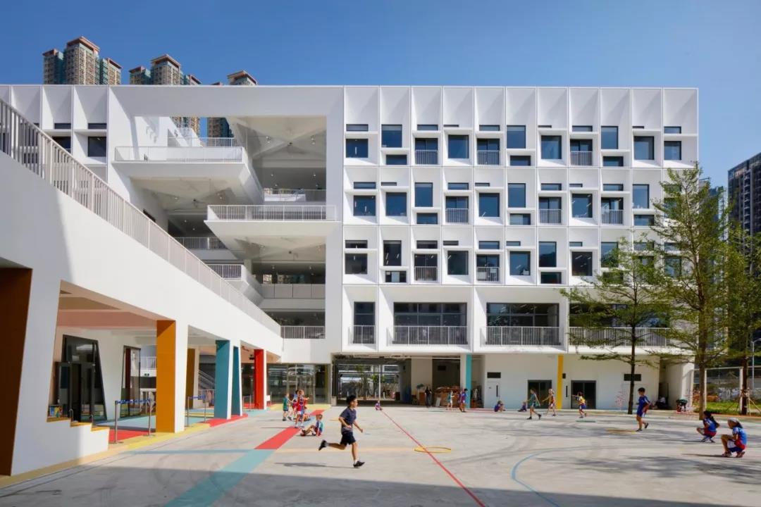 就在香港將軍澳區(qū)的街道上方,陽(yáng)光穿過(guò)由627塊彩色瓷磚組成的窗戶進(jìn)入大樓,與新校區(qū)萬(wàn)花筒般的立面交相輝映。
