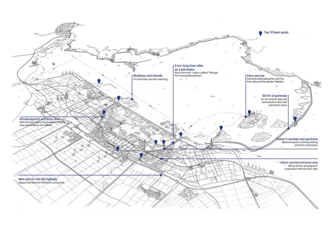 這里的四個重點自然保護區(qū) —— Oostvaardersplassen自然保護區(qū),Lepelaarplassen自然保護區(qū),Marker Wadden 自然保護區(qū)和 Trintelzand 自然保護區(qū)將會擴大,并且它們之間的聯(lián)系也將得到加強。同時增加的島嶼、沼澤、小溪、潮草原通過水域的連接將創(chuàng)造出一個可持續(xù)的生態(tài)系統(tǒng)。該項規(guī)劃旨在讓鳥類更容易能夠在一個地區(qū)覓食,并在另一個地區(qū)休息或繁殖。此外,方案中的 Nieuw Land “火車站” 將方便游客從阿姆斯特丹都會區(qū)及其他市區(qū)乘火車前往這座國家公園。