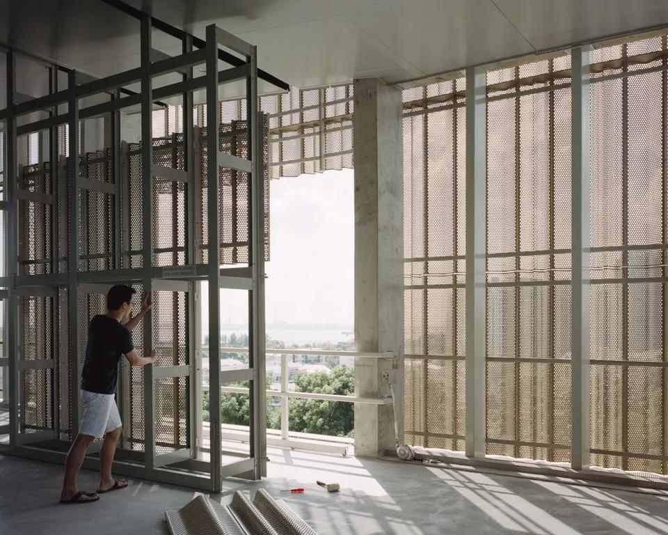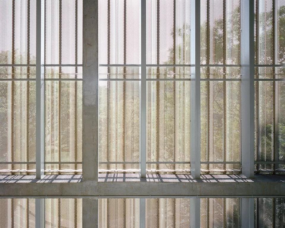 第四個空間位于東、西兩側幕墻的后方,用于樣品和模型制作。波紋穿孔鋁板緩和了東部和西部的強烈陽光,同時也具有可拆卸性,允許學生和研究人員測試建筑本身的各種立面系統。