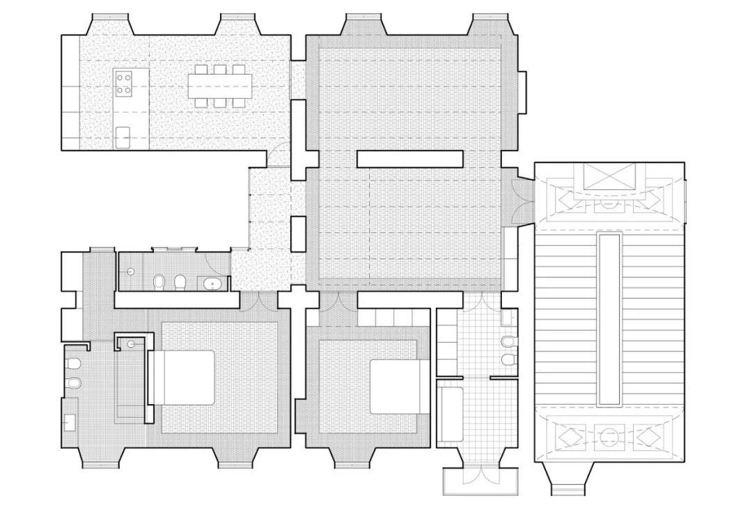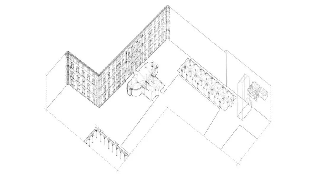 在18-19世紀之間,PalazzoDoria Pamphil的西翼被加建到出租公寓的建筑體量之上,至今這仍是它的主要功能。這個項目的意圖是:在宮殿的巨大公共空間之間建立一個清晰而有意義的空間序列,比如通向公寓的寬敞樓梯以及內部空間。這是通過創造一個迎接客人的拱形空間來實現的,同時提供柔和的漫射光。