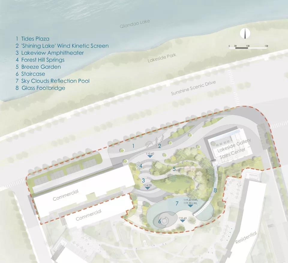 湖濱花園占地面積1公頃,位于千島湖陽(yáng)光路與規(guī)劃的高層湖景住宅區(qū)之間。景觀設(shè)計(jì)始于場(chǎng)地規(guī)劃,通過(guò)塑造地形,創(chuàng)造了一個(gè)穿梭于山水間的戲劇性空間序列,展現(xiàn)風(fēng)景如畫(huà)的湖畔之旅。