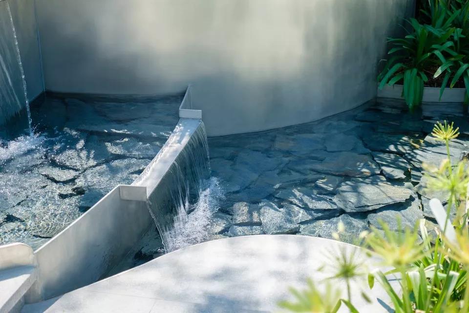 深灰色板巖噴泉,成為微風(fēng)花園空間轉(zhuǎn)換處的視覺(jué)焦點(diǎn)