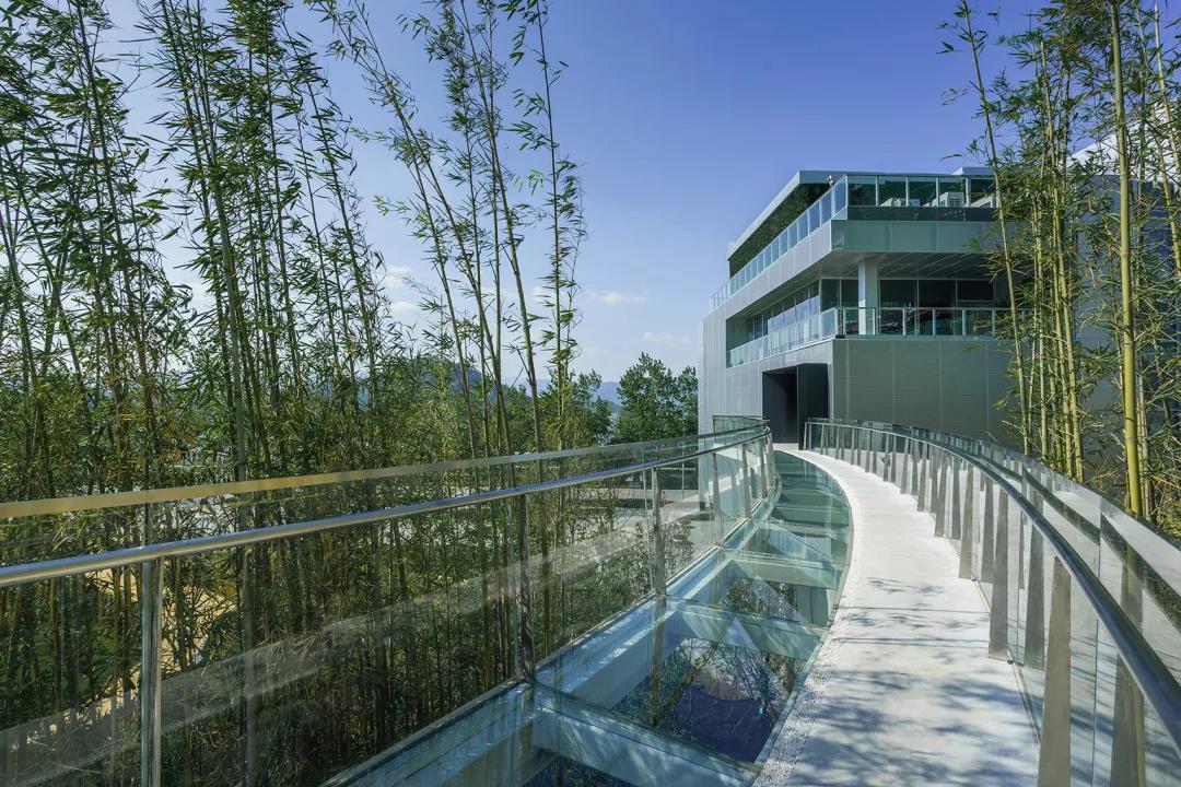曲線玻璃廊橋穿過(guò)搖曳的竹林,抵達(dá)湖畔畫(huà)廊前創(chuàng)造了一個(gè)寧?kù)o的時(shí)刻。