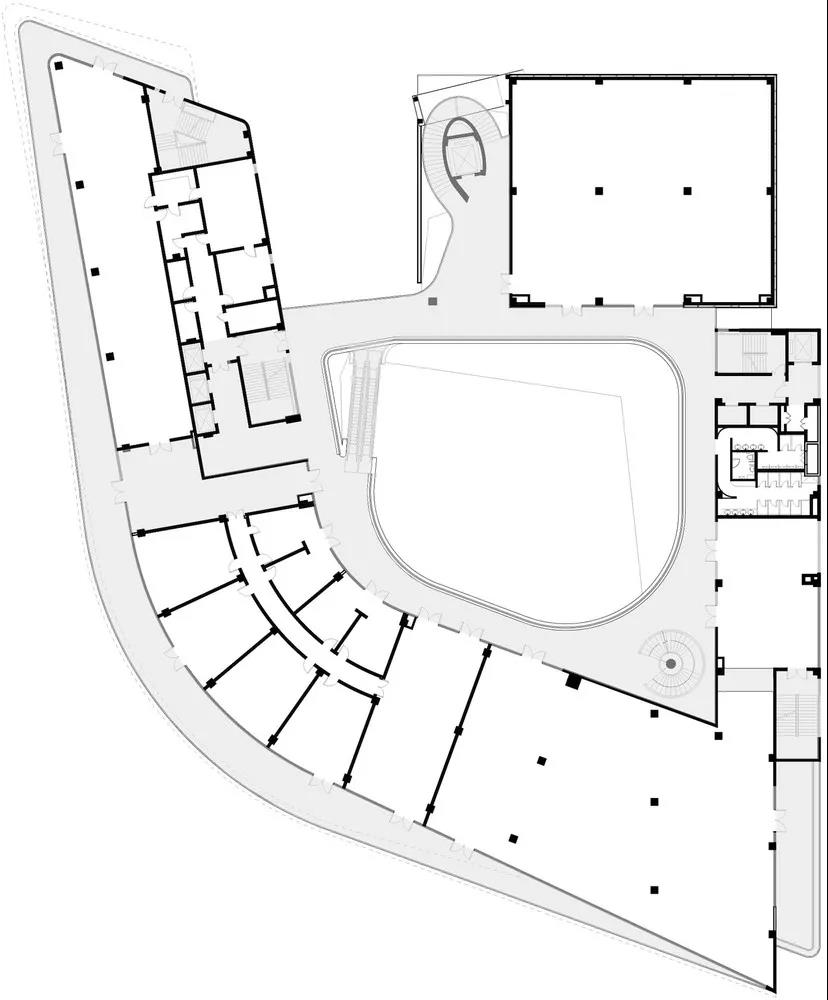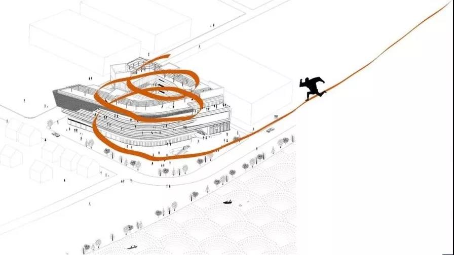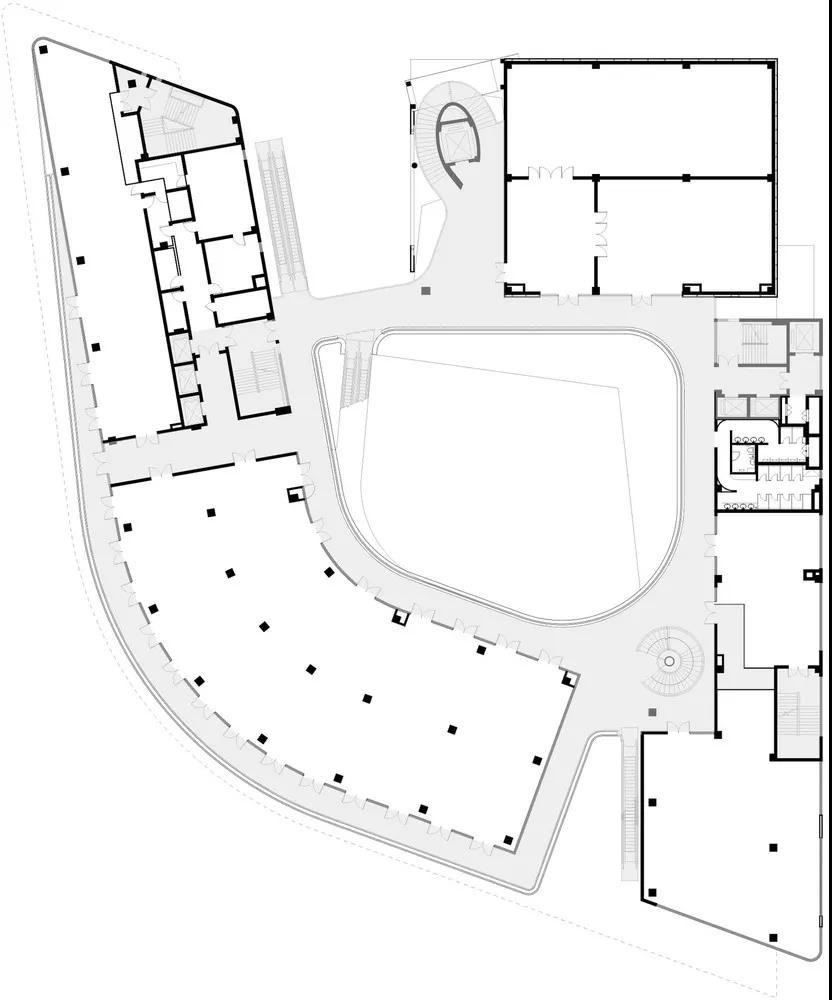 于是把街道放平,以不設門的開放入口和樓梯聯合各層,使內院和外走廊成為城市廣場及街道的延伸。為了吸引市民爬上5層高的觀景臺,每一層的外廓都通過平面的進退形成不同的“取景器”。