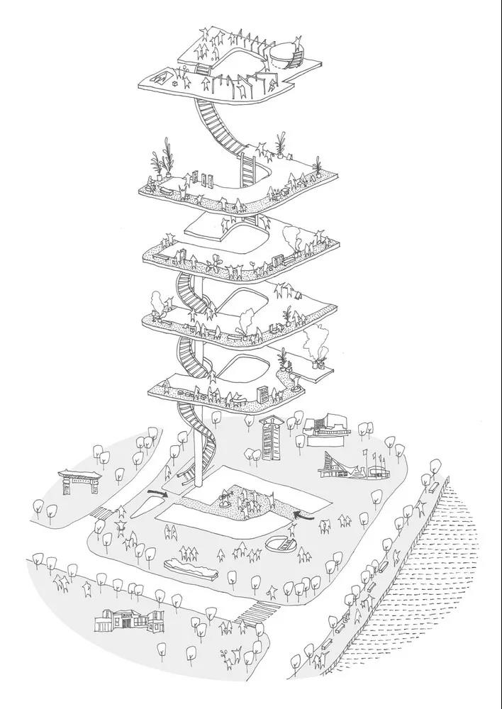 第三個思考的問題是可持續發展。民間資金去做藝術公益舉步維艱,希望不僅節約基建成本,更要節約日后的運營成本。生態建筑,綠色建筑都是新興名詞,所有符合「常識」的傳統建筑都冬暖夏涼。南方地區最有效的是遮陽加通風。包含內院的平面對加強通風十分有利,能解決遮陽變能最大程度減低能耗。于是就有了這個憑常識計算出來的方案:在建筑的西南面懸掛一條緩緩爬升的外廓,作為西南立面的遮陽系統,把“偉大的街道”一直延長到天臺,帶你飽覽城市全景:向東是旭日東升的CBD珠江新城,向西是夕陽余暉下的舊城。一開始外廊的方案是斜坡,功能空間都朝向內院。這樣的處理無疑在外觀上似乎更具建筑的樣式感,但這樣一來,具有公共性的“街道”就同功能單元以及內院完全割裂,變得同周邊的建筑一樣,私有空間同公共空間有嚴格的等級,經緯分明,無法融合,難以形成富有生機的共享社區。