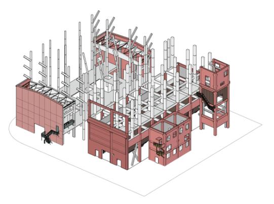設(shè)計(jì)最大限度地保留了原來廢棄和預(yù)備拆除的工業(yè)建筑及其空間、結(jié)構(gòu)和外部形態(tài)特征,將新結(jié)構(gòu)見縫插針地植入其中并疊加數(shù)層,以容納未來的使用功能:下部的大跨度廠房——“倉”作為公共活動(dòng)空間,上部的客房層——“閣”漂浮在廠房之上。