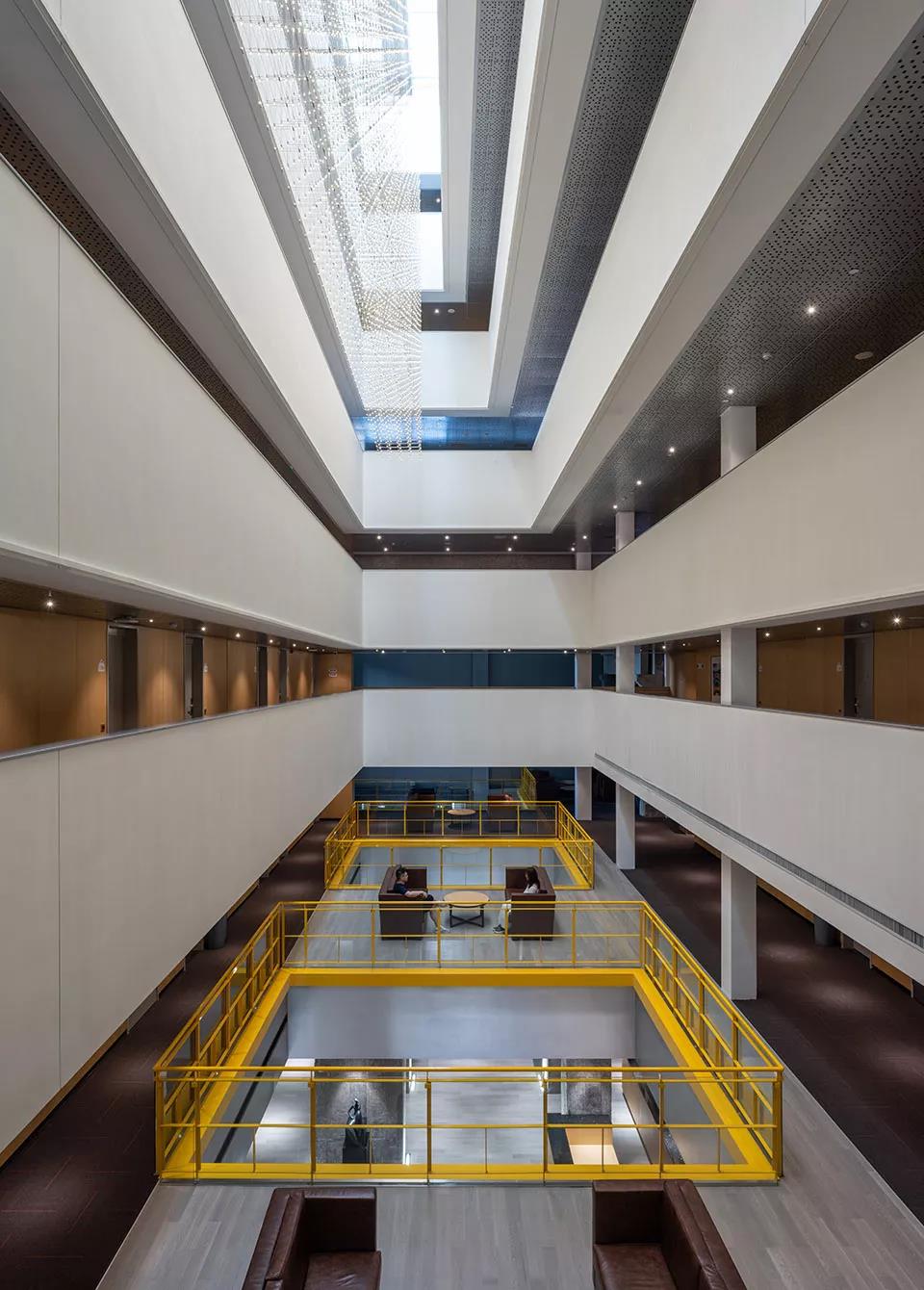 錯(cuò)落高聳的采光中庭在“閣”內(nèi)形成頗具儀式感的“塔”型內(nèi)腔,藝術(shù)燈具從天窗向下垂落,宛如一片輕盈虛透的金屬幔帳,柔化了寧靜硬朗的空間形式,與原始粗獷的工業(yè)遺存形成鮮明對比。