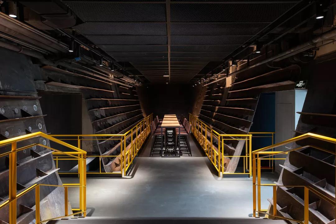 “倉閣”南區(qū)由原返焦返礦倉、低壓配電室、N3-18轉(zhuǎn)運(yùn)站改造而成,3組巨大的返礦倉金屬料斗與檢修樓梯被完整保留在全日餐廳內(nèi)部。
