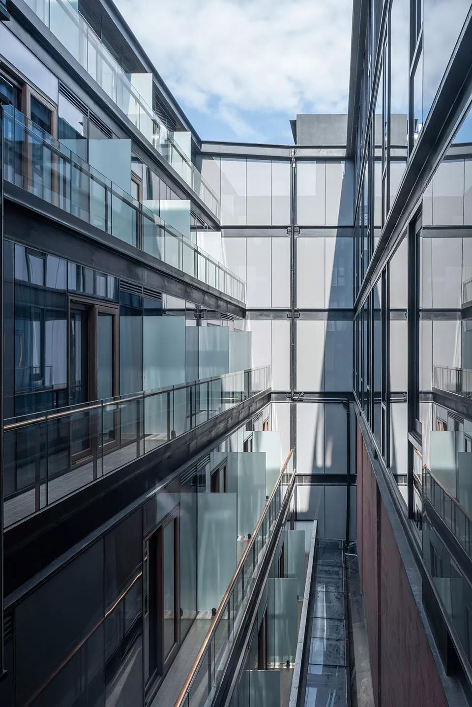 原建筑的東、西山墻及端跨結(jié)構(gòu)得以保留,吊車梁、抗風(fēng)柱、柱間支撐、空壓機(jī)基礎(chǔ)等極具工業(yè)特色的構(gòu)件被戲劇性地暴露在大堂公共空間中,新結(jié)構(gòu)則由下至上層層縮小,屋頂天光通過透光膜均勻漫射到環(huán)形走廊,使整個(gè)客房區(qū)域充滿寧靜氛圍。