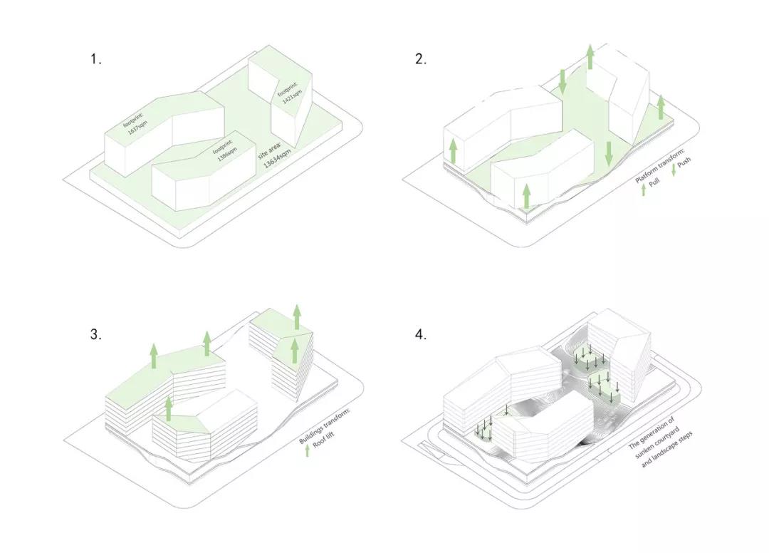 如果說(shuō)項(xiàng)目場(chǎng)地為“2”,其中的建筑為“1”,那么建筑之外的場(chǎng)地空間將成為“2-1”后所剩的“1”。零壹城市對(duì)個(gè)園的設(shè)計(jì)思考,便是打破“2-1=1”的常規(guī)等式。三幢塔樓以“三足鼎立”之勢(shì)分別位于場(chǎng)地東側(cè)、西北側(cè)和西南側(cè),形成內(nèi)向性的整體布局。而裙房又將三個(gè)相對(duì)獨(dú)立的建筑體塊連結(jié),形成連續(xù)而豐富的活動(dòng)空間,沿北側(cè)輔路設(shè)置開(kāi)敞公共空間節(jié)點(diǎn),引導(dǎo)公共空間周邊的服務(wù)配套發(fā)展,與相鄰地塊合力形成組團(tuán)公共服務(wù)中心。如此被加厚的城市界面,形成“2-1=3”的空間關(guān)系。塔樓與裙房的結(jié)合如同海上的鯨魚(yú)正破浪躍出海面。