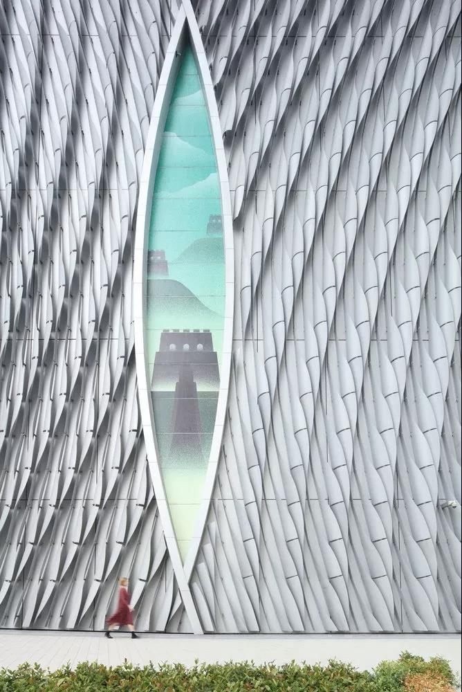 戲曲中心活躍的立面由一個模塊化的鰭片系統組成,由未經處理的航海級鋁管切割而成,沿著建筑排列成交替的圖案,讓人想起舞臺上串珠幕布后閃爍的燈籠。立面的編制金屬板像窗簾一樣在建筑的四個角落被拉回,將光線射向外部,吸引游客自由進出內部庭院,享受展覽、攤位和致力于推廣戲曲豐富遺產的工作坊。